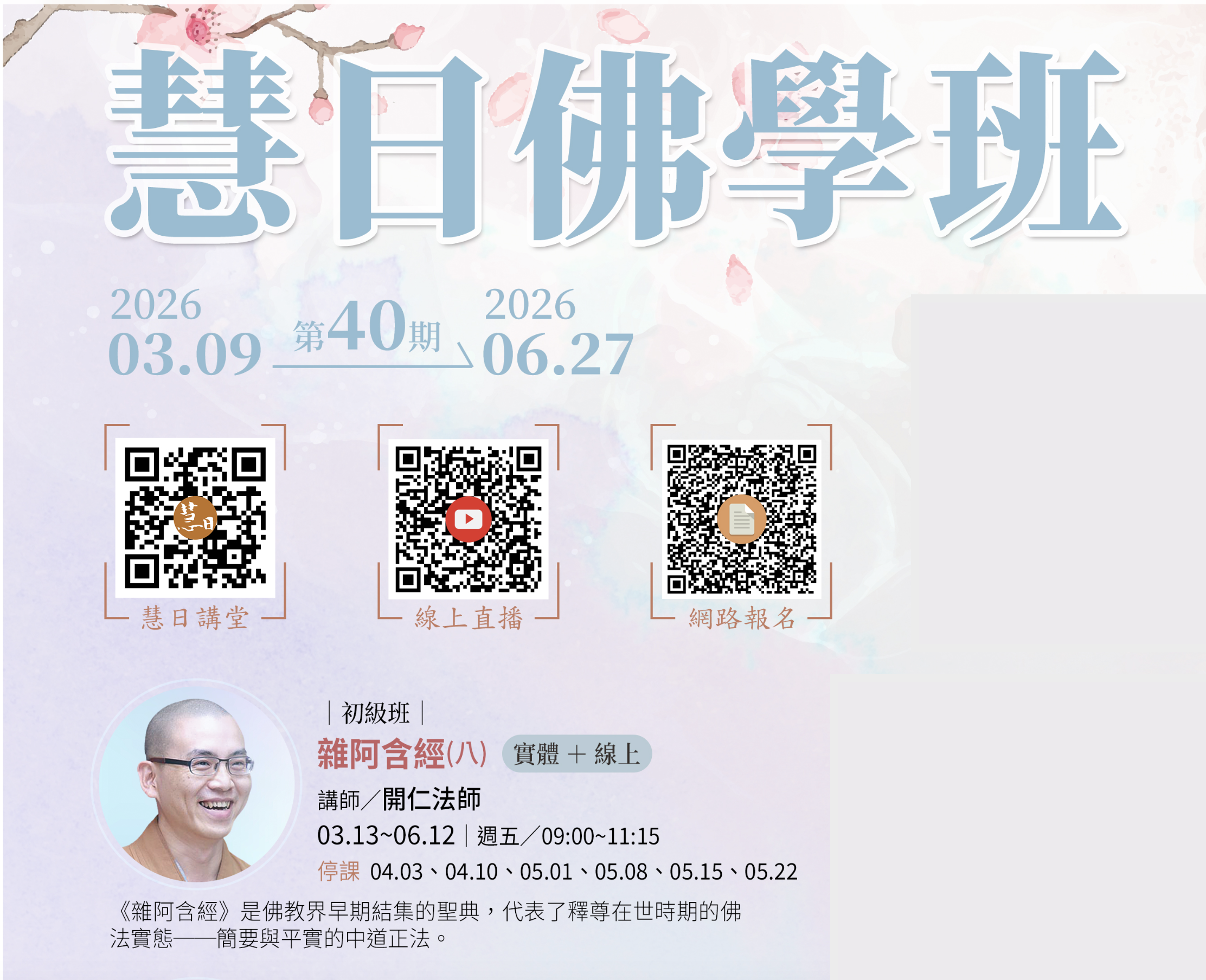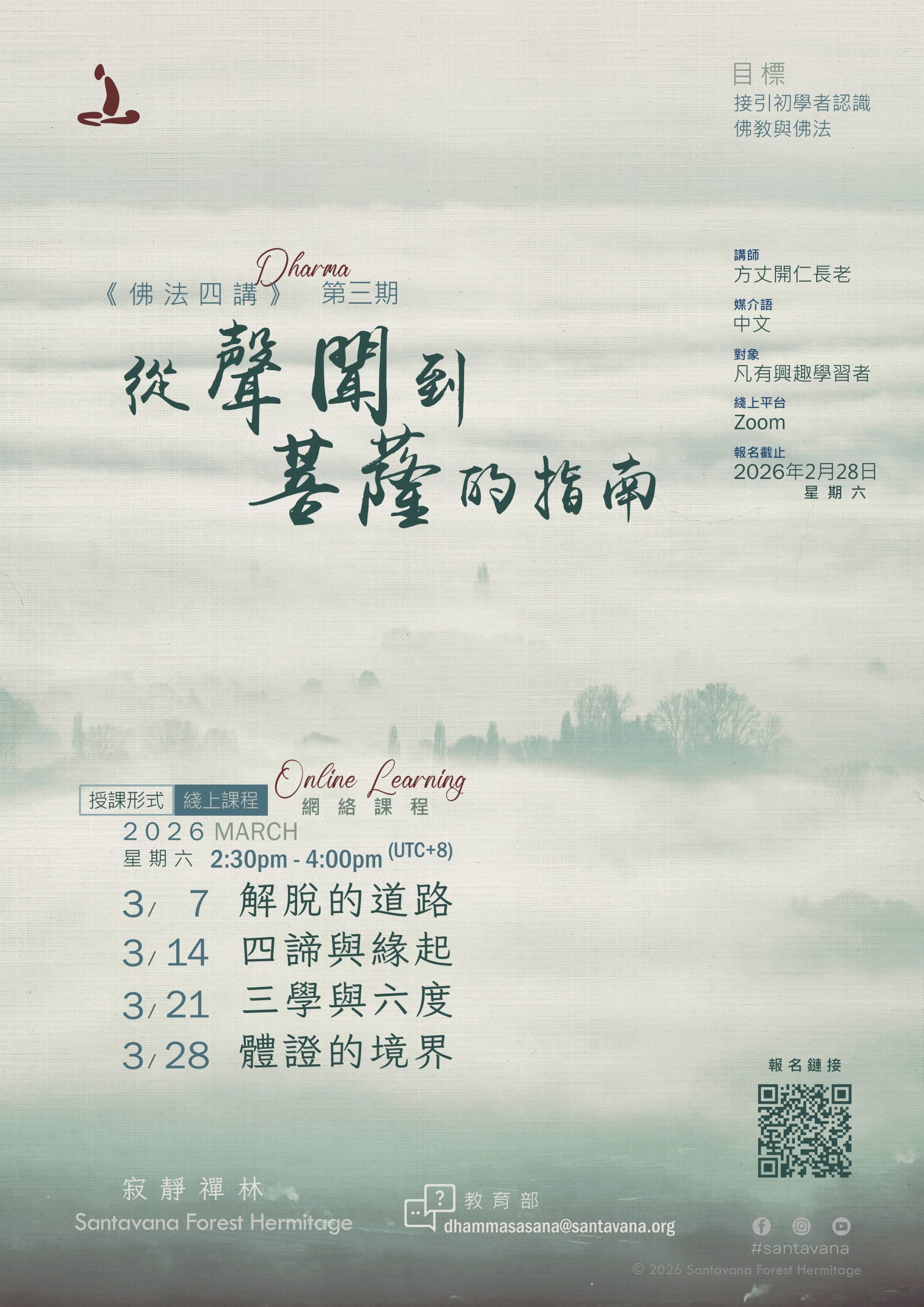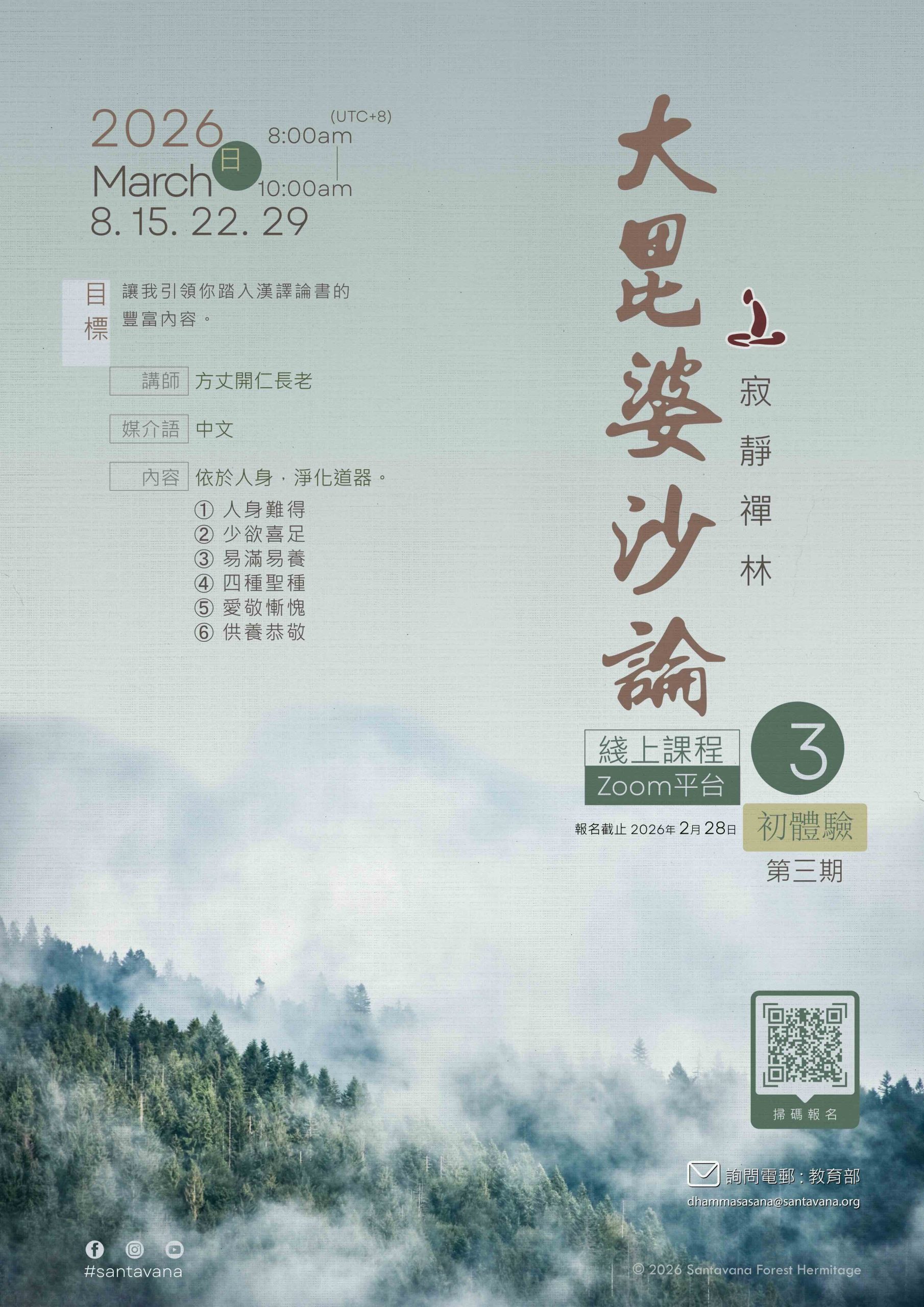 「安般念十六特勝」禪七(第一期)( 2025年12月23日 – 30日)報導 01/01/2026 No Comments 的確,這完整止觀次第的教學,在現今社會,是可遇不可求的。難得開印阿闍梨應禪林開仁方丈請法,開辦這為期三年的課程。阿闍梨在方法指導上,以其深厚的禪修經驗,淵博的巴利語詞掌握,配合經論注疏講解,逐字逐句地教導這過去諸佛證果時共用的業處! 夜間則由開仁方丈為大家開示。方丈會溫和地分享他向阿闍梨確定修習方法上的一些小細節,也一再勸導學員們必須清楚學習的目標,及感恩珍惜每次修習的因緣。 Read More »