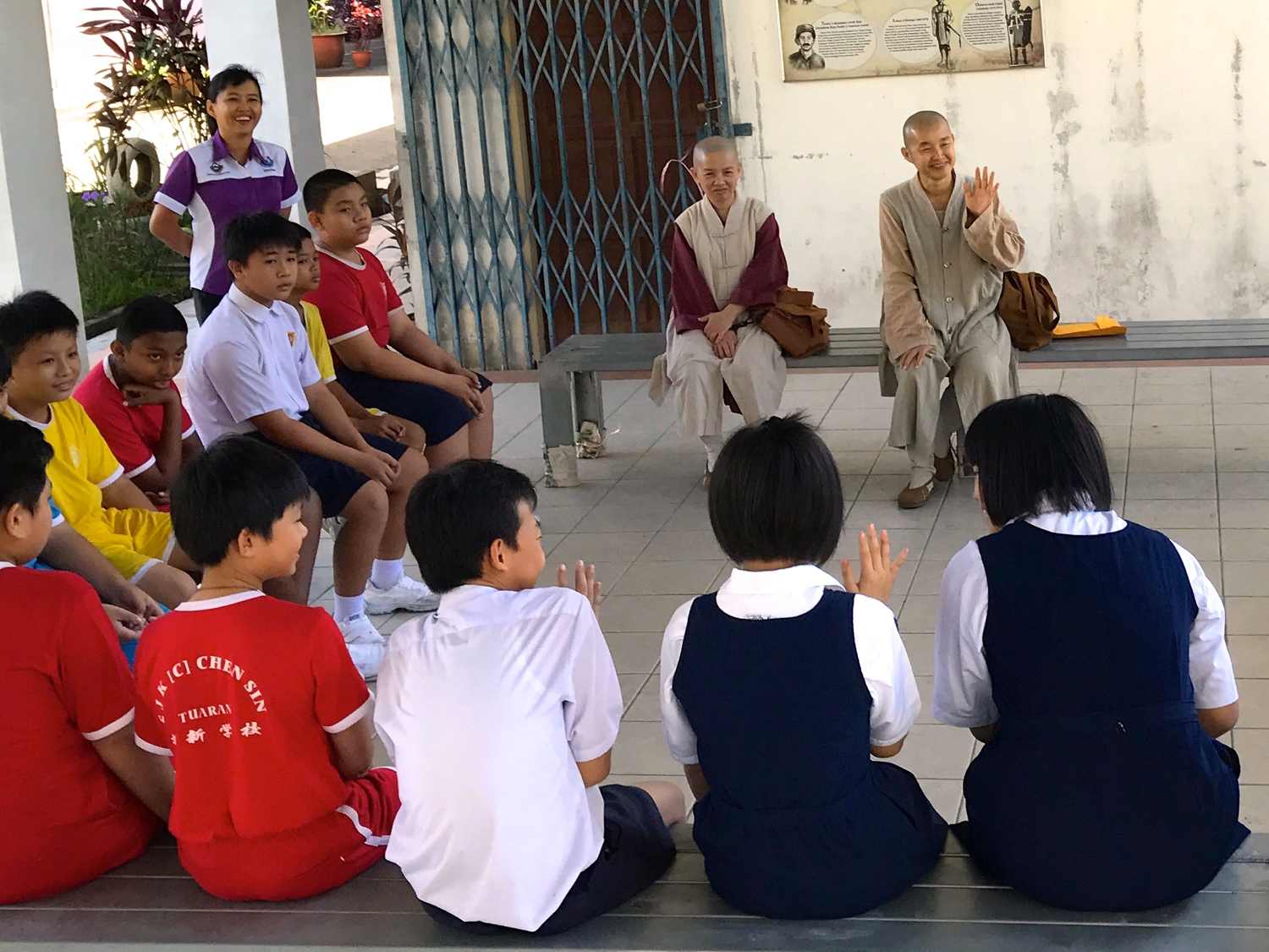2017年8月22日上午8am至9am,性厚比丘尼及禪念比丘尼在碧鳳居士的陪同下前往振新小學。首先,性厚比丘尼為同學們開示培養好習氣的重要性,然後帶領同學們誦念《吉祥经》,也灑淨散播慈念和派送吉祥線和書籤。