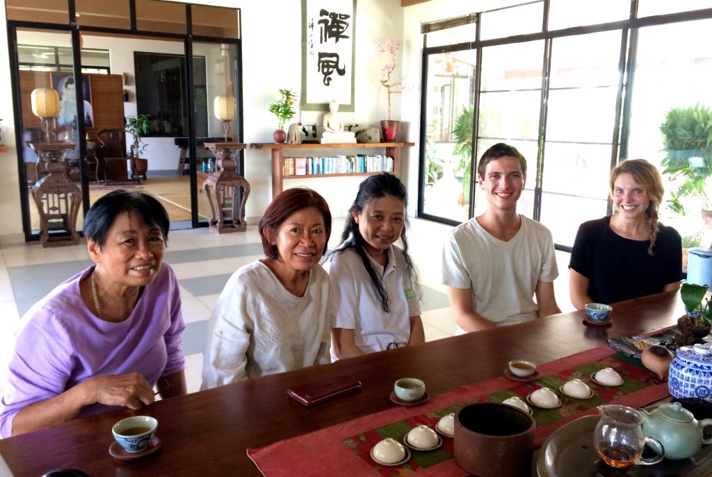 9月13日每週三來寂靜禪林供僧的靜真、淨永、顯惜等也與兩位國外義工們交流。