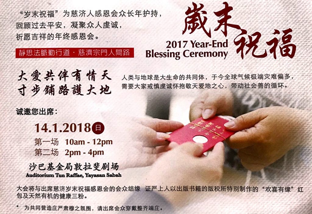 2018年1月10日(三)上午9時30分,張植青(惟遠)居士(臺灣慈濟功德會亞庇聯絡處負責人),翁濟隆居士(臺灣慈濟功德會亞庇聯絡處副負責人)及高先生特地前來寂靜禪林,邀請寂靜禪林僧眾出席今年1月14日一年一度的歲末祝福。