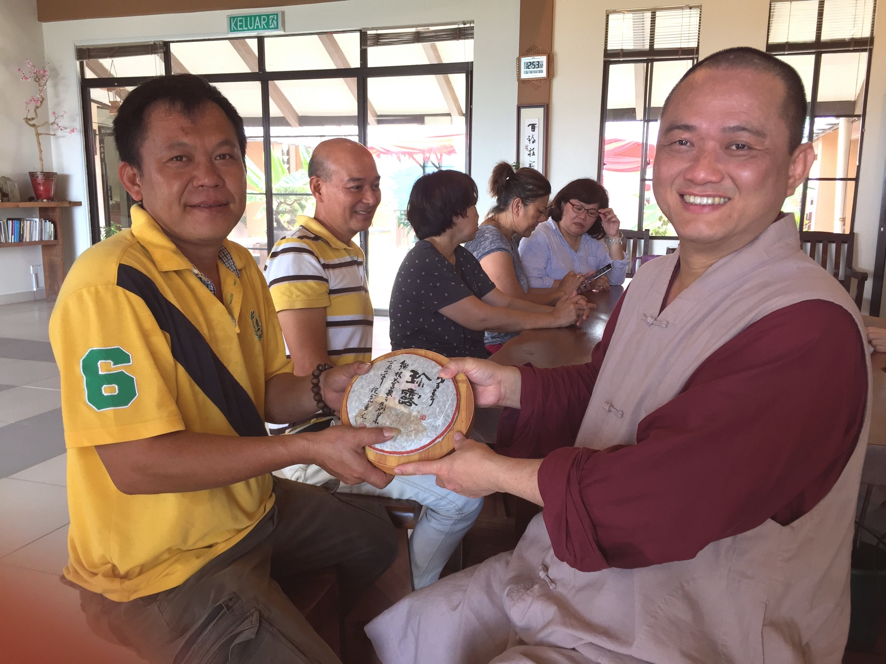 寂靜禪林住持開印阿闍梨今天中午從美國弘法回到寂靜禪林,住眾向住持接駕之後,大家喝茶聖法談。在場的還有短住幾天,來自德國ACC負責人戴炳輝居士(左四),來自汶萊的張沛霖居士(右三)及洪小菁居士(右二),以及亞庇蘇秋匯居士(右一)。