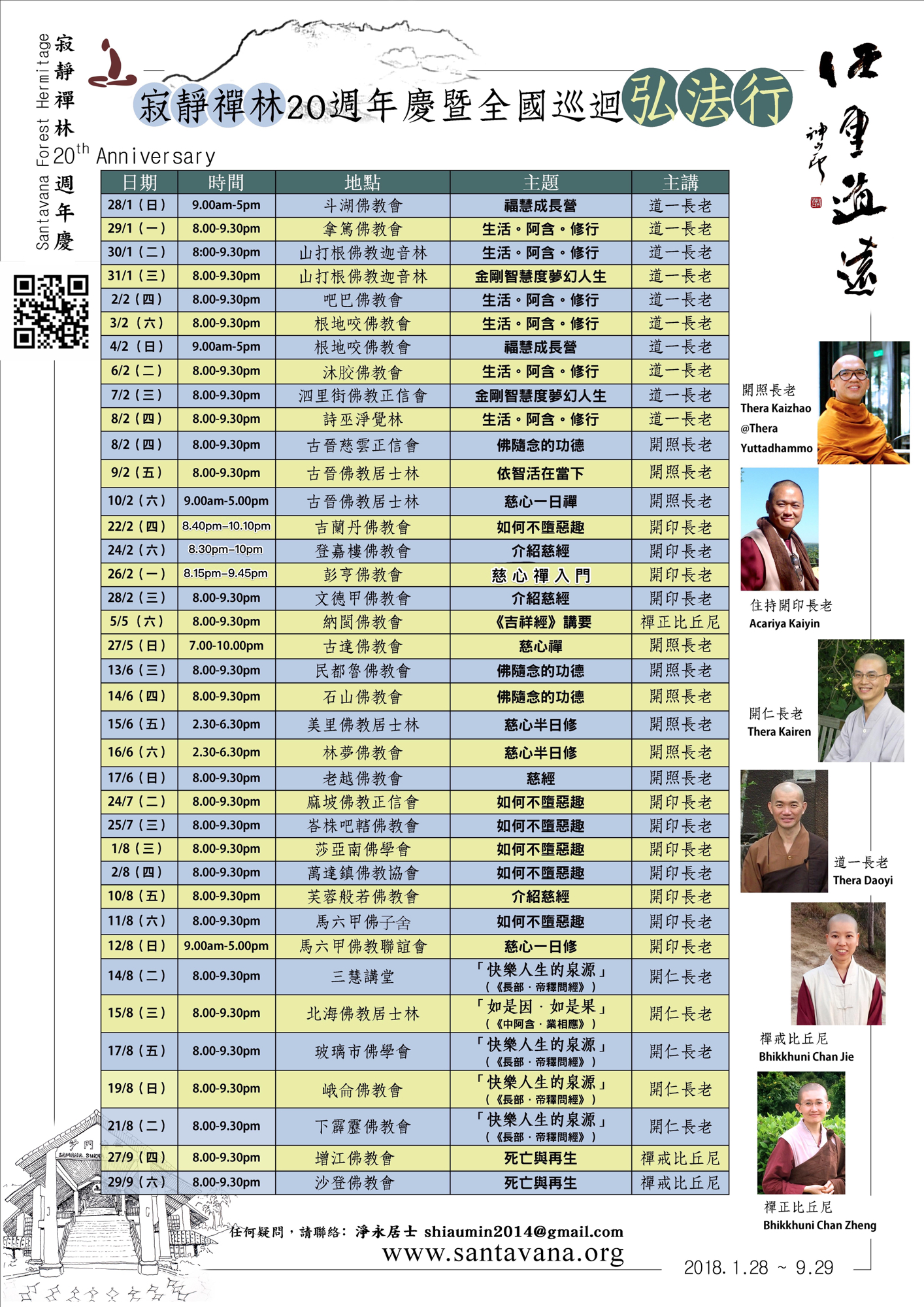 日期:2018年1月-9月 團隊:僧伽董事會成員的開照長老、開印阿闍梨、開仁長老、道一長老、禪戒比丘尼及禪正比丘尼。 地區:全國各地佛教團體 系列活動主題:「正見增上、解行並重」,內容包括專題演講、福慧成長營、慈心一日修、佛隨念一日修等。 行程表: