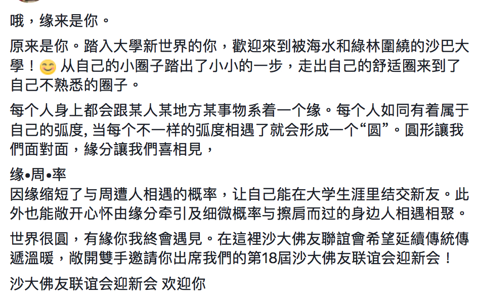 世界很圓,有緣你我終會遇見。在這裡沙大佛友聯誼會希望延續傳統傳遞溫暖,敞開雙手邀請你出席我們的第18屆沙大佛友聯誼會迎新會!