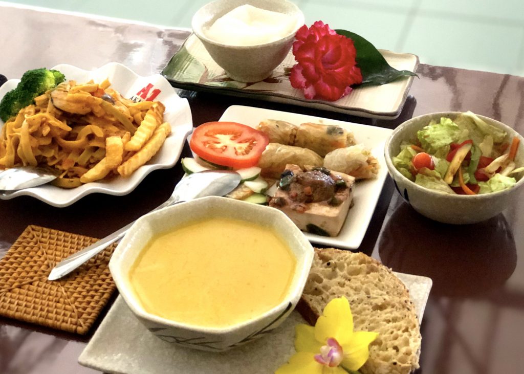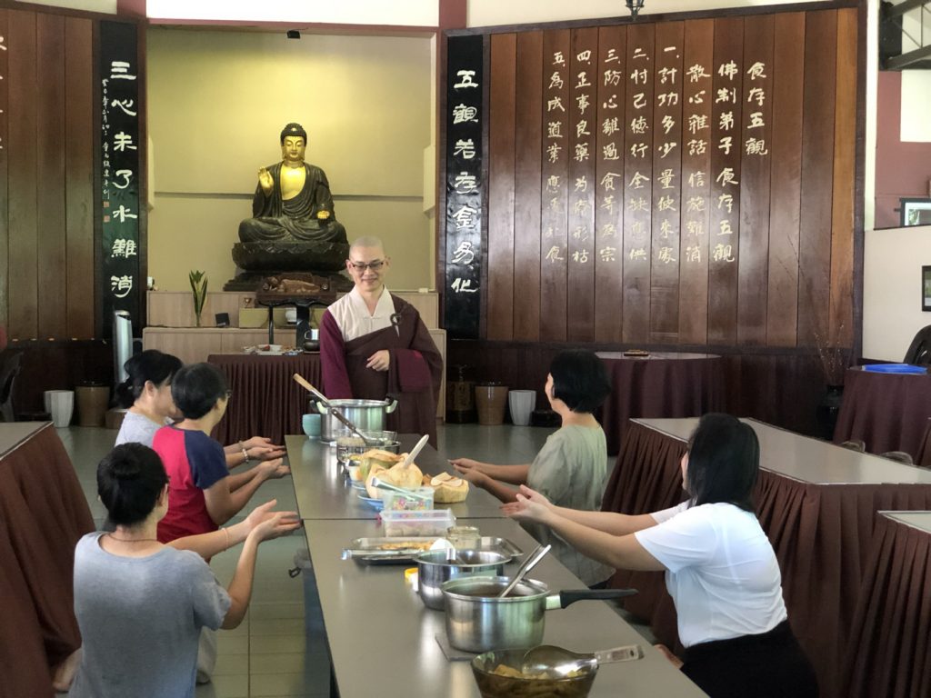靜慈準備了義大利面供僧,所以其他人也配合以西式餐點供僧,護法會會長淨宜準備了沙拉,靜傳則準備濃湯及水果,月芳也煮了一道本地特色菜供僧。在過程中,大家以充滿正念和歡喜的心準備,同時也用心地將食物擺設好,務必呈現最好的食物來供僧。