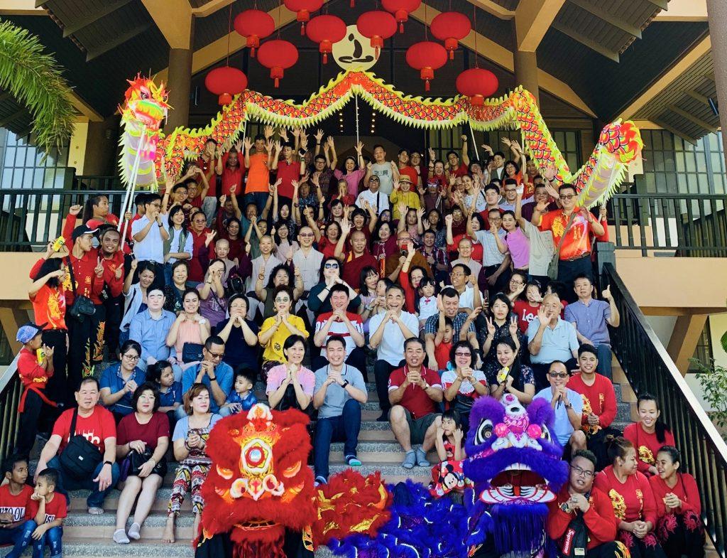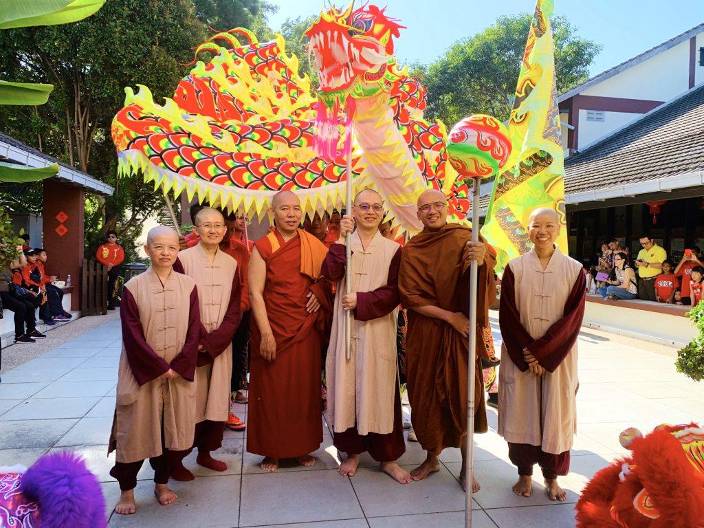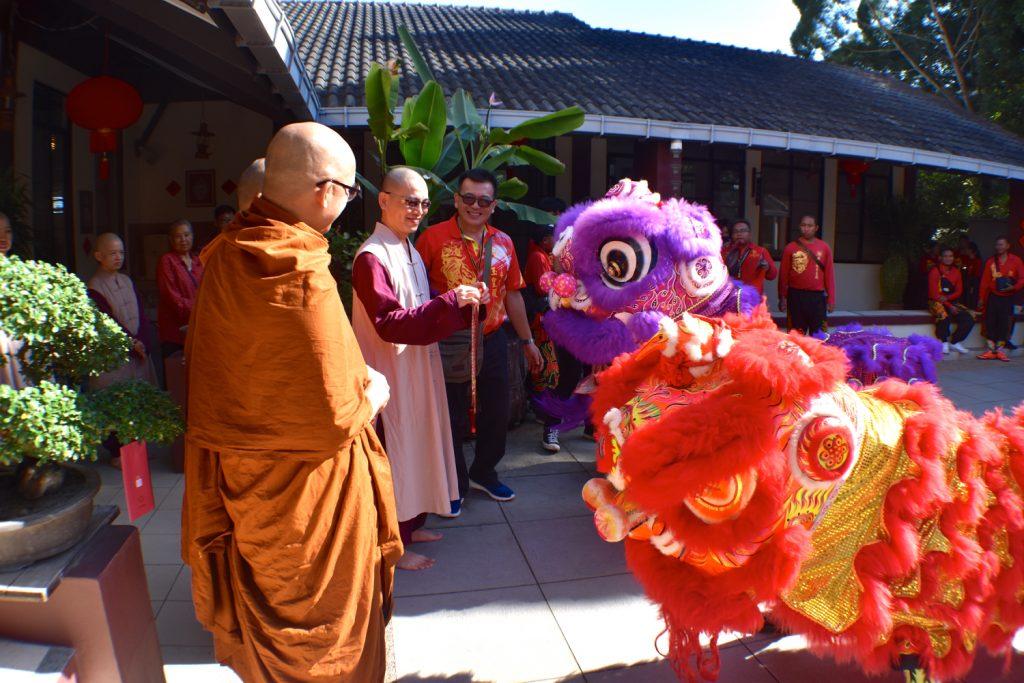 早上九點十分,斗亞蘭玉皇殿龍麒獅團以兩場分別在行政大樓及沙門樂住的舞獅舞龍表演,開啟了今年寂靜禪林的新春團聚。他們呈現的龍獅獻瑞熱情奔放,活力十足,為大眾帶來生機勃勃的新年氣息。今年,龍麒獅團在開照長老的指引下,以嶄新的“龍團圓”方式,與僧團及大眾合影。之後,大眾便移步到禪堂內,聆聽師父們的開示與祝福。
