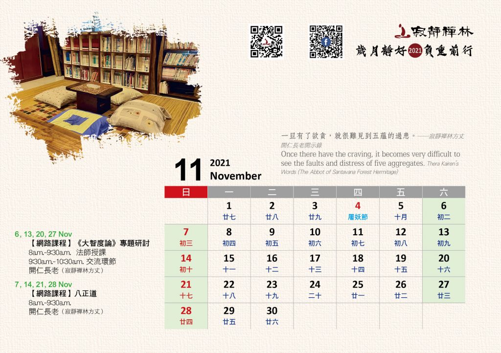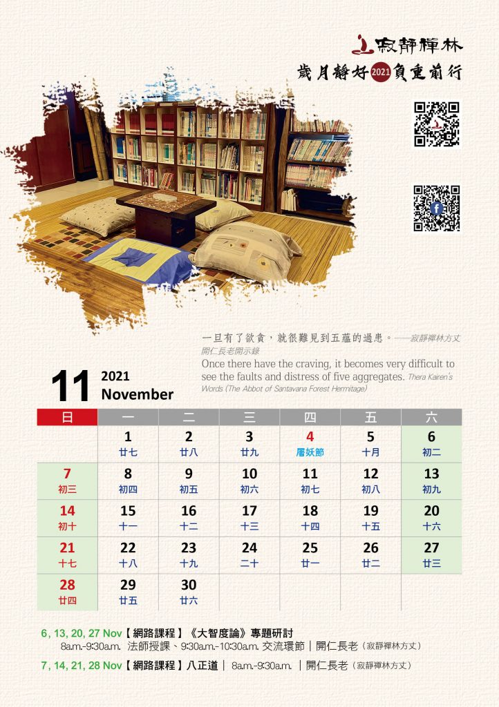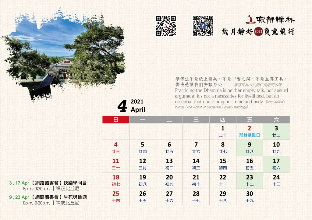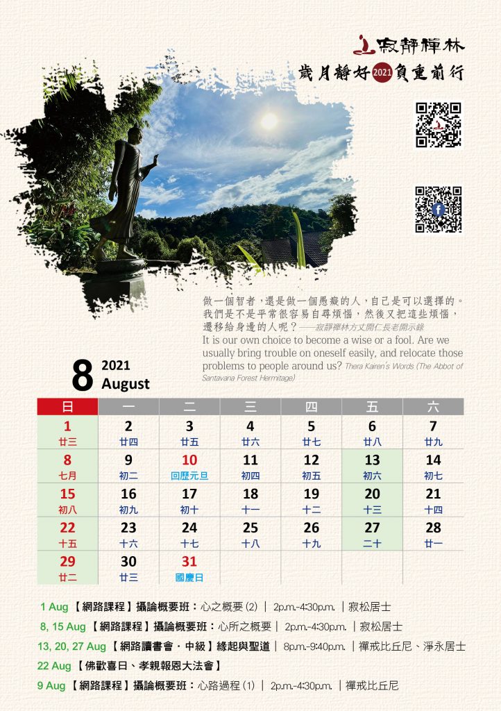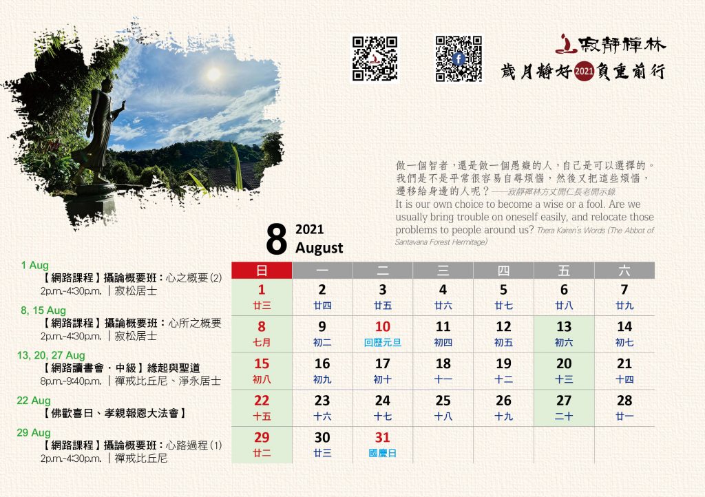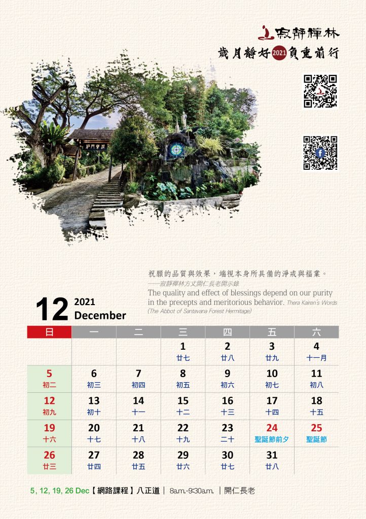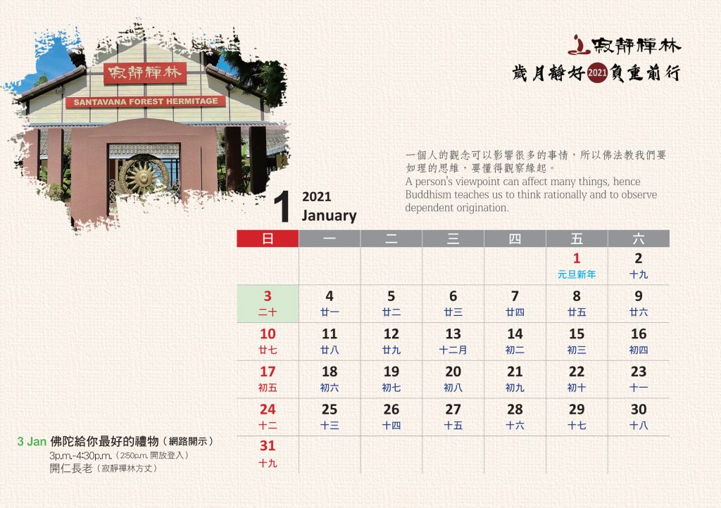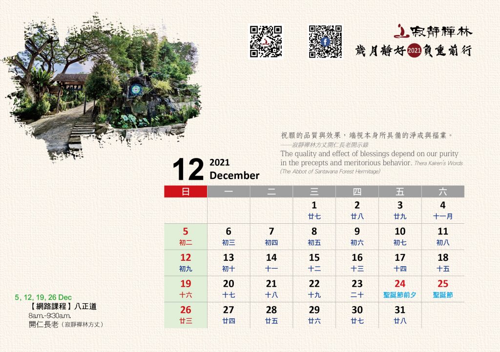 寂靜禪林2021年電腦與手機版月曆的法語是從方丈過去諸多開示裡摘錄出來的詞句及感恩道一長老的英譯,與大家分享!