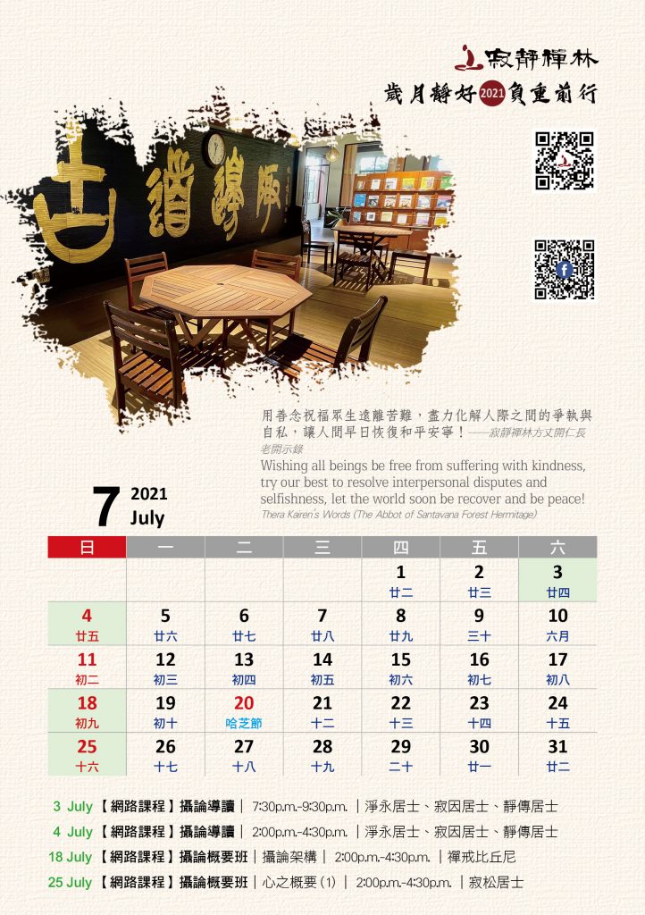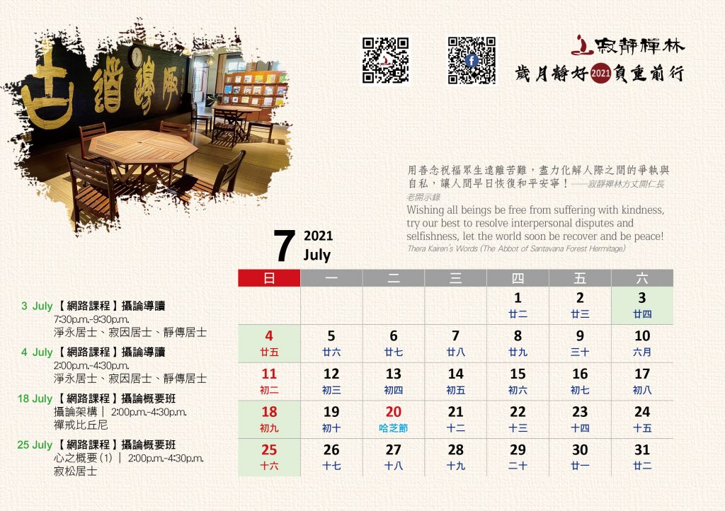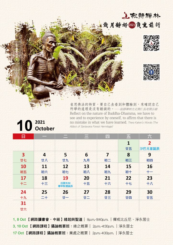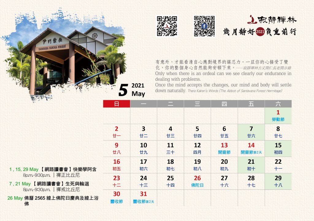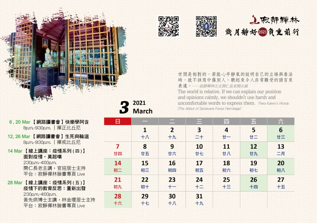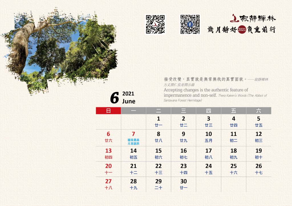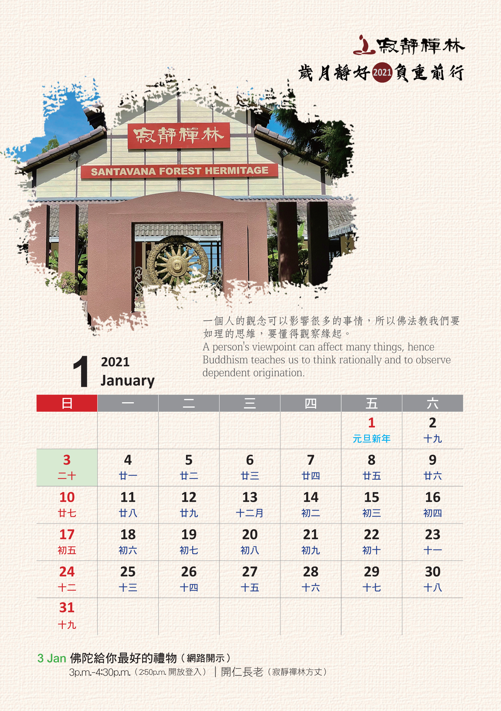 寂靜禪林2021年電腦與手機版月曆的法語是從方丈過去諸多開示裡摘錄出來的詞句及感恩道一長老的英譯,與大家分享!