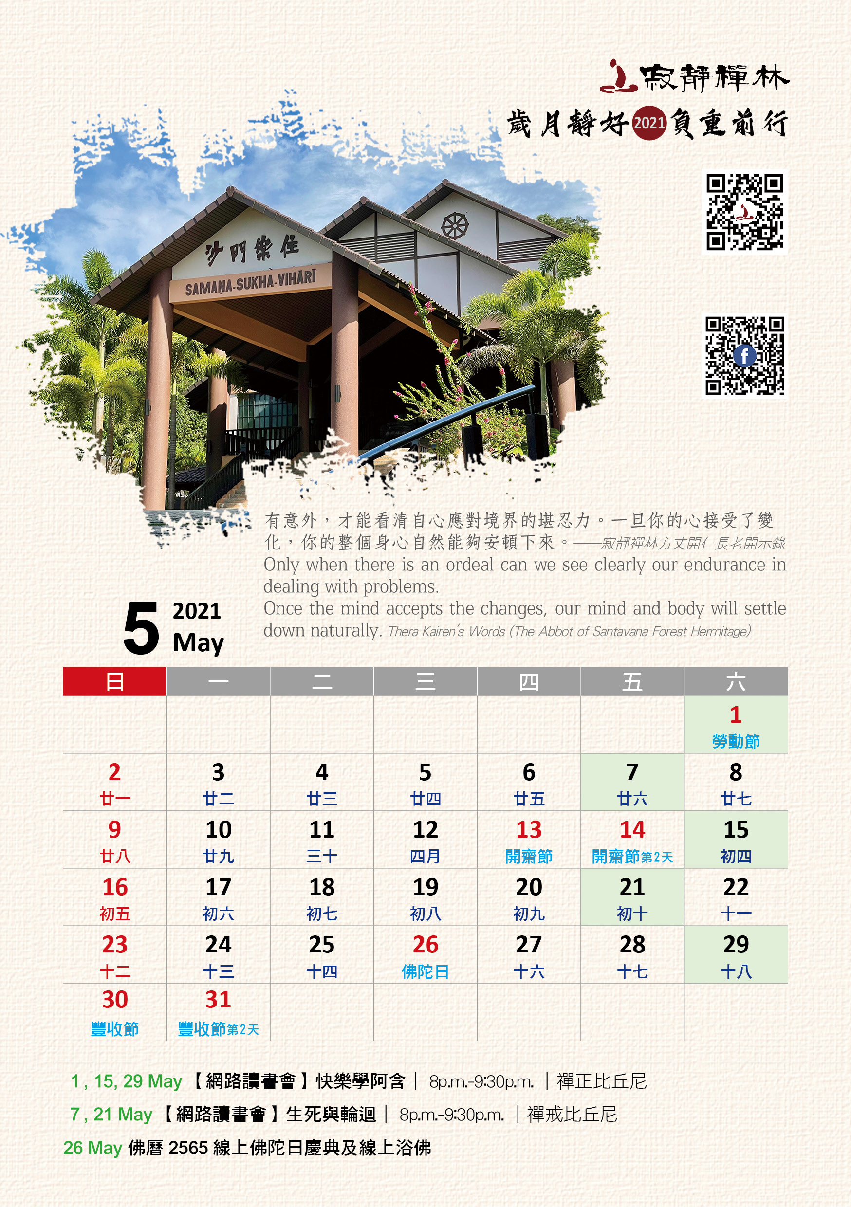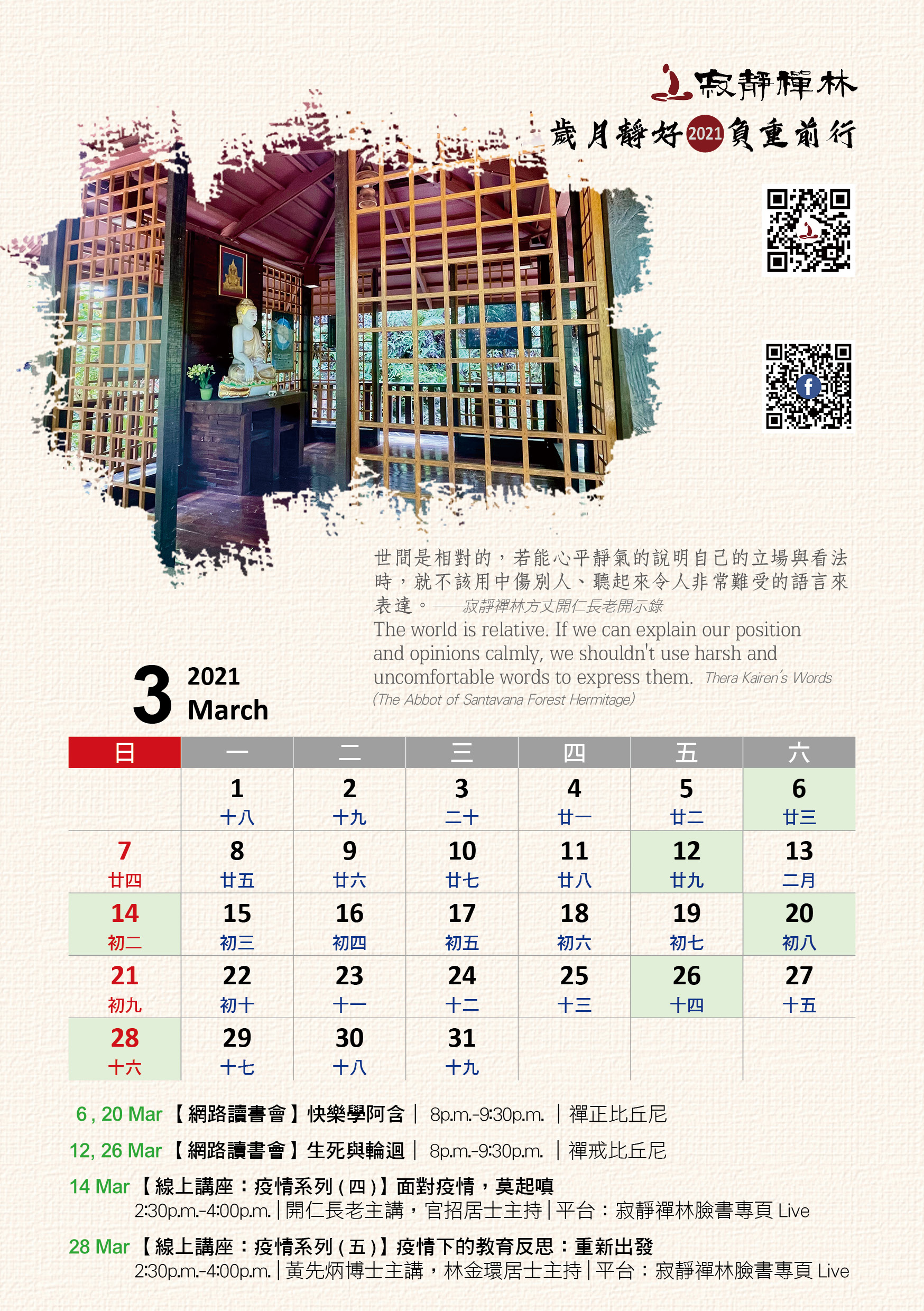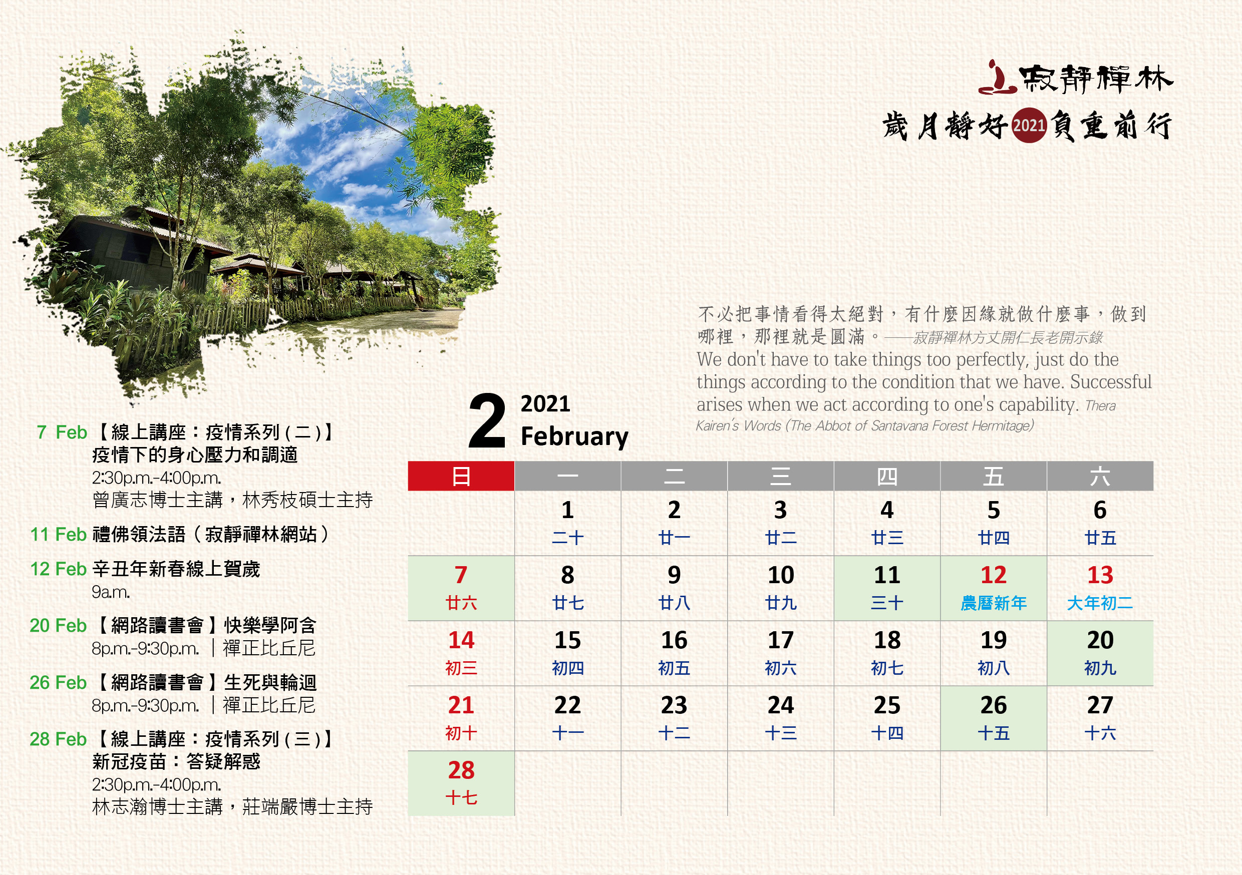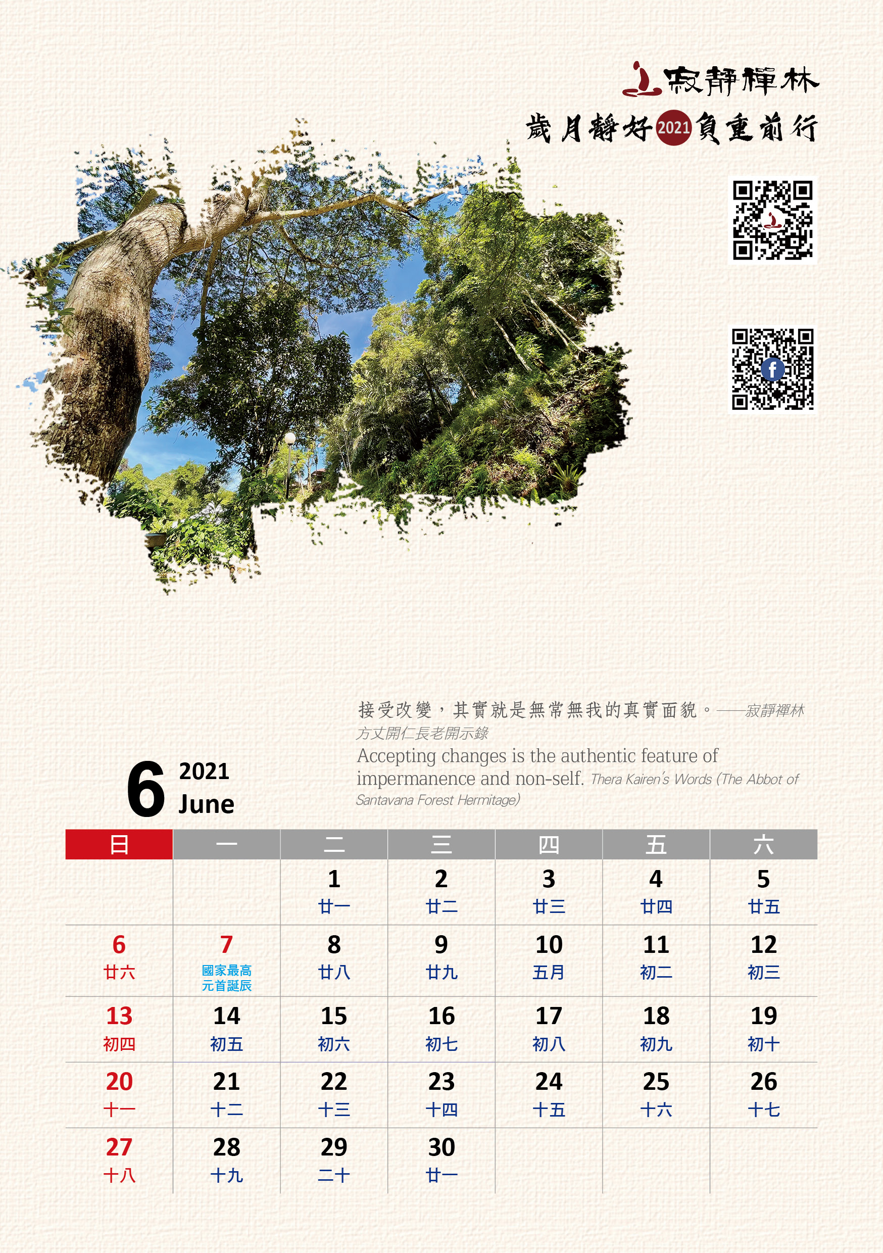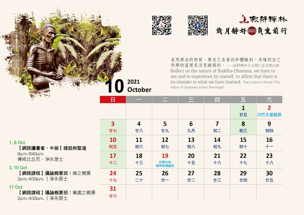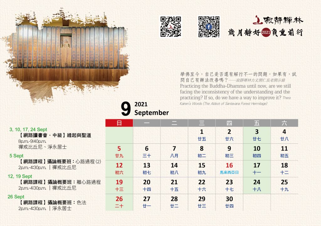 寂靜禪林2021年電腦與手機版月曆的法語是從方丈過去諸多開示裡摘錄出來的詞句及感恩道一長老的英譯,與大家分享!