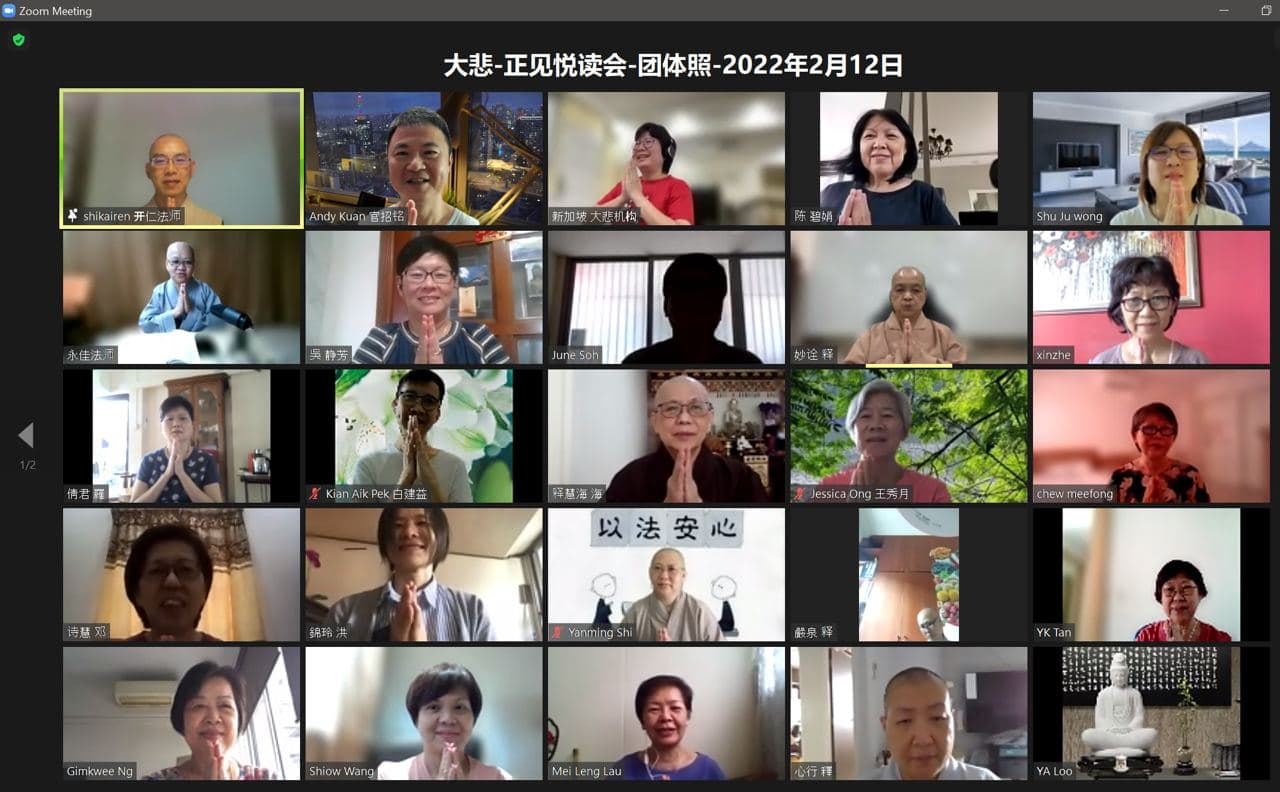 2022年2月12日是新加坡大悲佛教中心的正見悅讀會在新的一年的第一次讀書會,正見悅讀會的同學是閱讀長老的《37品講義》及觀看錄製視頻及定時討論。開仁長老(寂靜禪林方丈)非常的慈悲到來為大家祝福開示,約有五十位與會者共同參與。