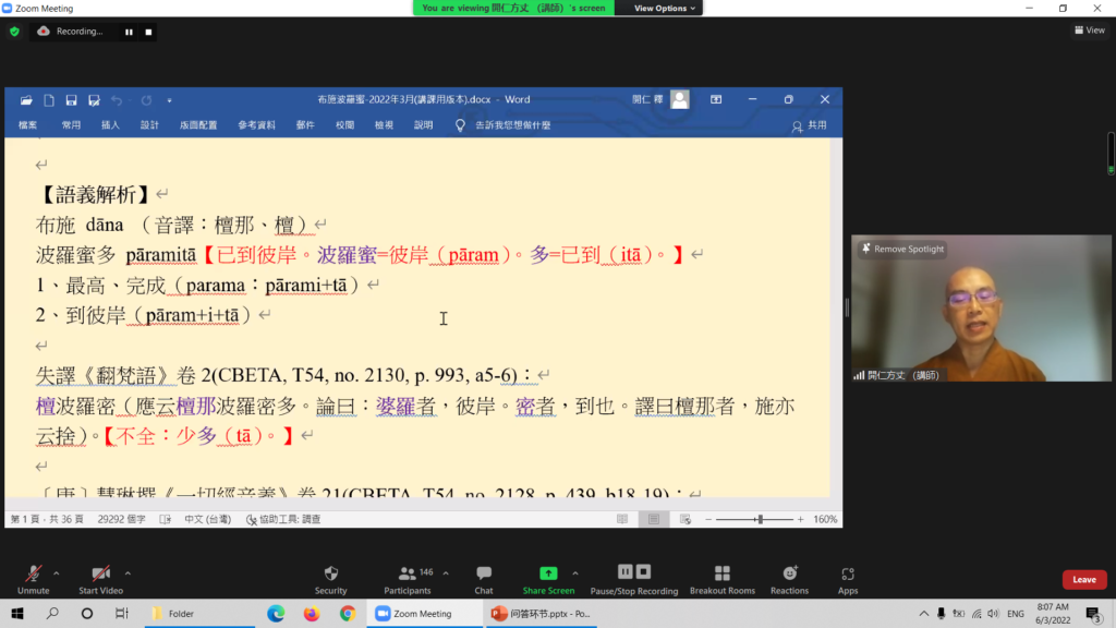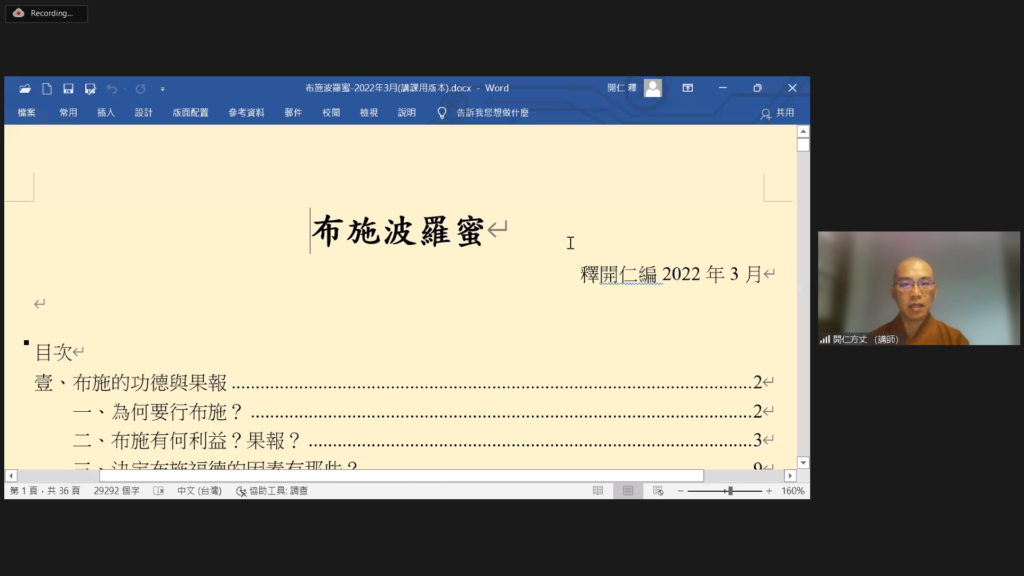 由寂靜禪林主辦、方丈開仁長老主講的 《大智度論布施波羅蜜》網絡課程已於2022年3月6日正式開課,此項課程共有4堂課,於2022年3月的每個星期日上午8時至10時進行,將於3月27日結束 。