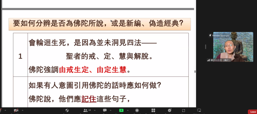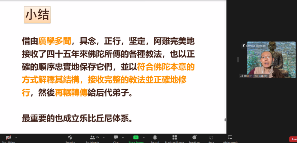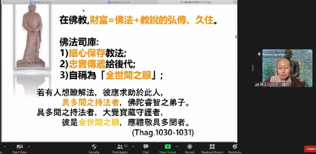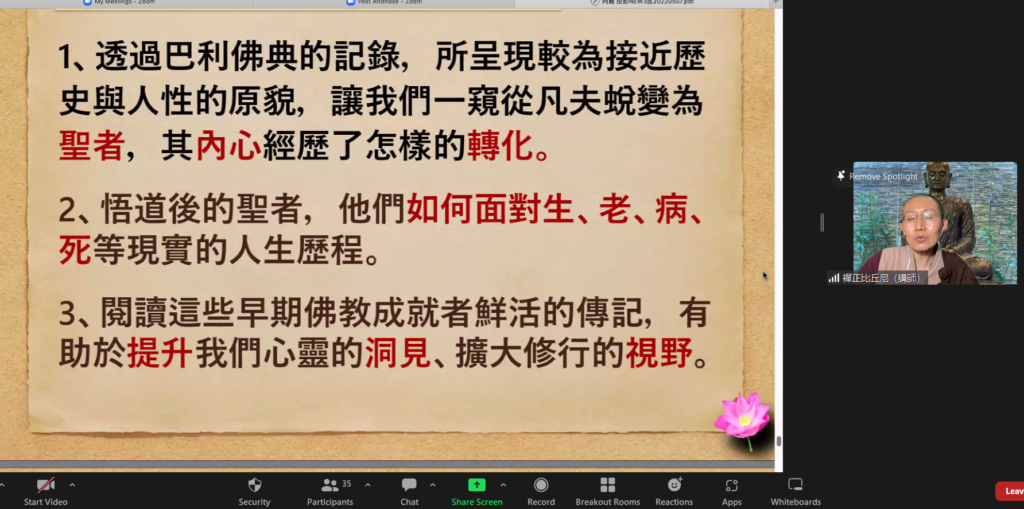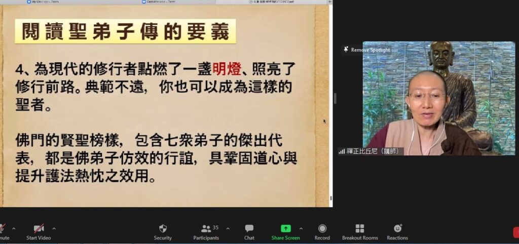 禅正法師很用心地以圖文講解聖弟子們的生平,清晰的圖文可以幫助學員們釐清思路及了解一個個聖弟子的故事。在法師的闡述下,爲之動人的聖弟子傳呈現于眼前,也感動于心。在此課程中,學員們認識了佛陀的「雙賢弟子」,佛法大將–舍利弗和神通第一–目犍連;另外也包括僧團之父–大伽葉和佛法司庫–阿難四位尊者。