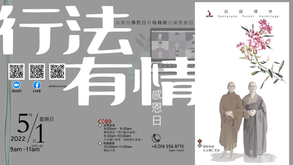 就在這5月的第一個週末,為慶祝佛陀日與母親節的感恩節日,寂靜禪林主辦了「行法有情」感恩日 ,歡迎大家於5月1日 9a.m.-11a.m.(UTC+8)線上參與此盛會。