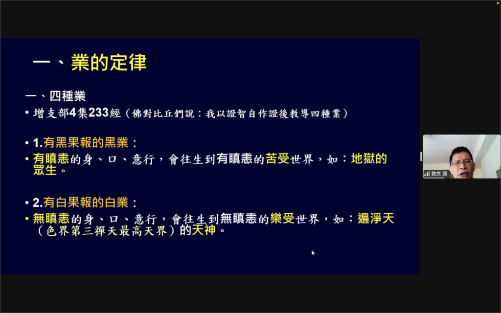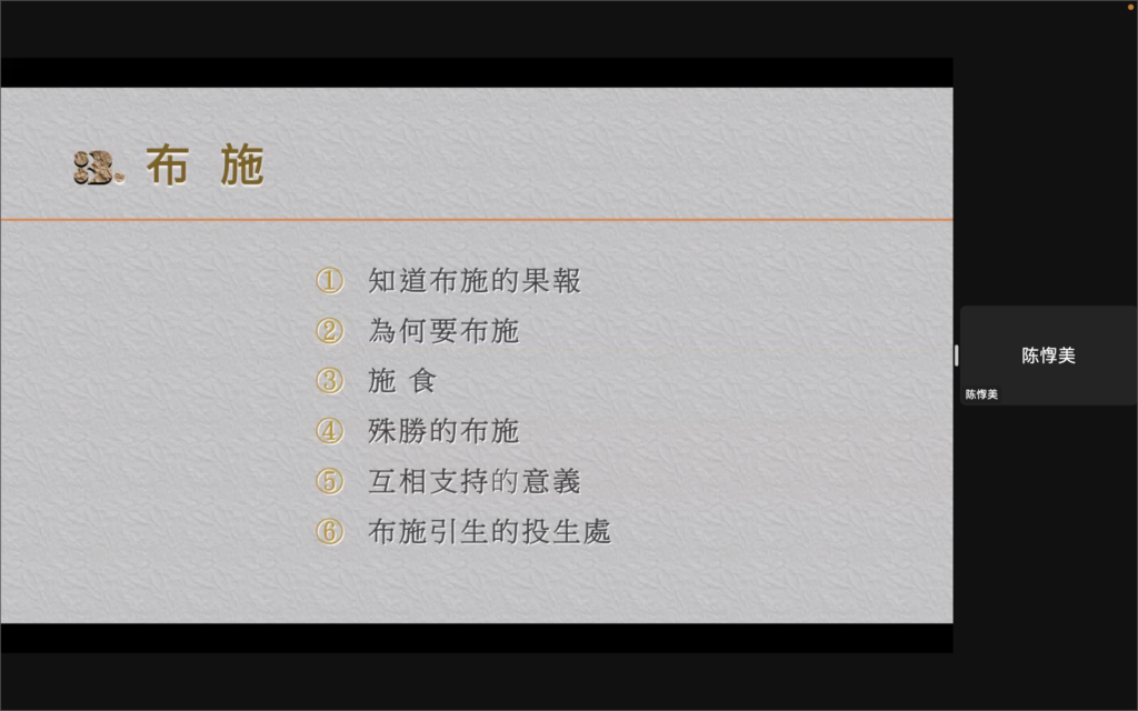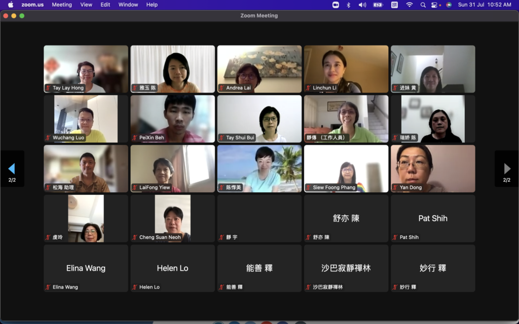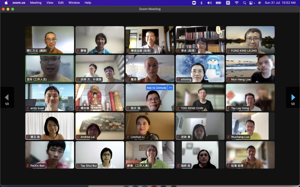 經過七月份5個星期日,每次約3小時的上課後,「佛陀的話語」研讀與培訓班於是日結束了第一期的課程。這5堂課探討了菩提長老編排的《佛陀的話語》(Bhikkhu Bodhi, “In Buddha’s Words”)前面5章內容。共有五個主題: 《人類的現實》、《光明的使者》、《親近佛法》、《當生可見的福樂》及《投生善趣的方法》。內容是初學者欲對佛法深入理解的基礎,第二學期的後5章則會探究修行的要義。
