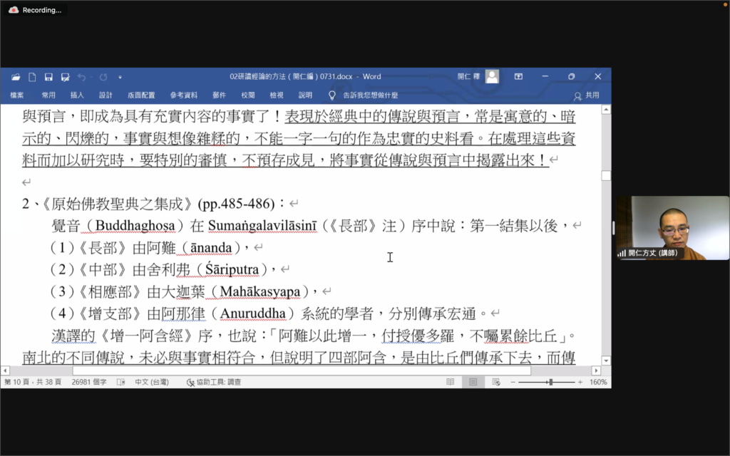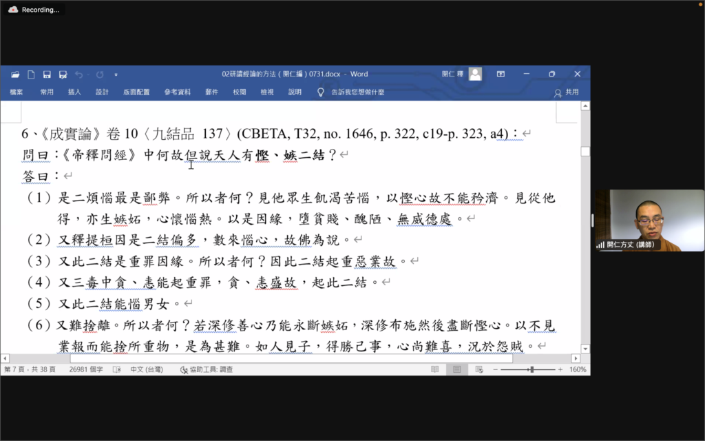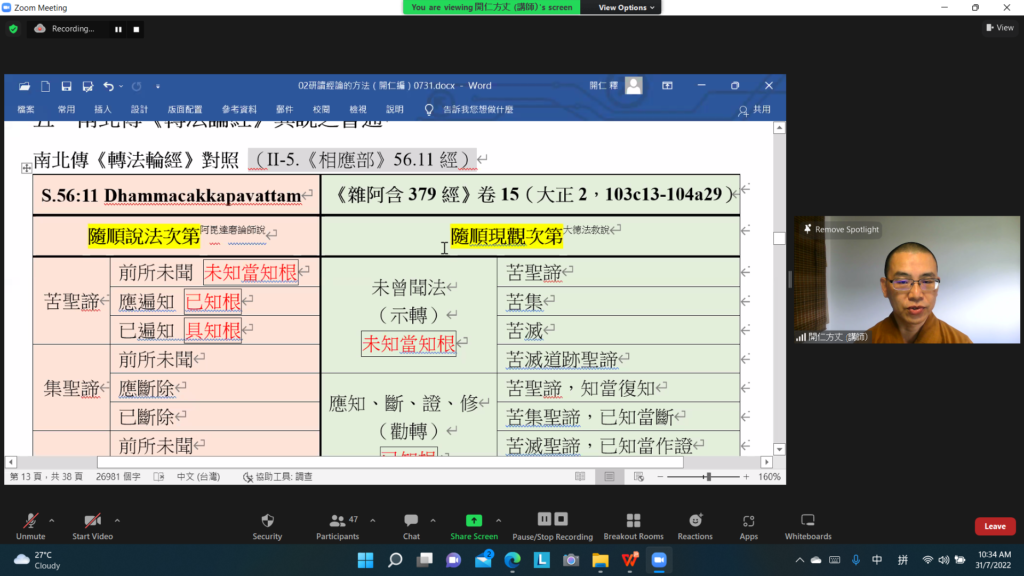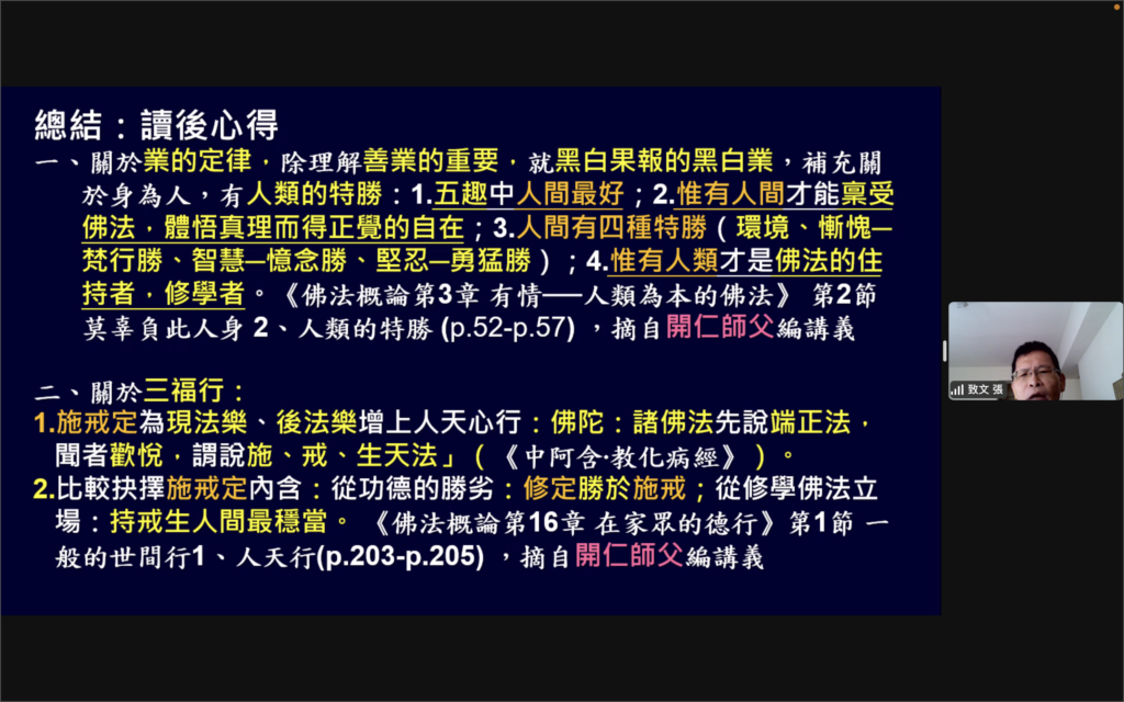 指導老師開仁方丈在每一堂課開示並引導學員注意導論部分的重點及指導如何研讀經典及相關資料。第二時段,由講習員報告各章經文要點。講習員們都竭盡所能製作投影片,熟讀經文、摘錄重點,提供相關的補充資料與大家分享。之後方丈就講習員的表現及內容給予講評。同時慈心指導大家在分享中應注意的事項: 如聽眾的華文程度、所引用的資料必須說明出處、或此資料屬那一時期的說法及表達重點時該停頓的地方等。因此講習員及學員都從中受益不淺。在前四堂課的分組討論中,學員通過助理們的引導加強對經典的理解,並學習如何運用在生活中。
