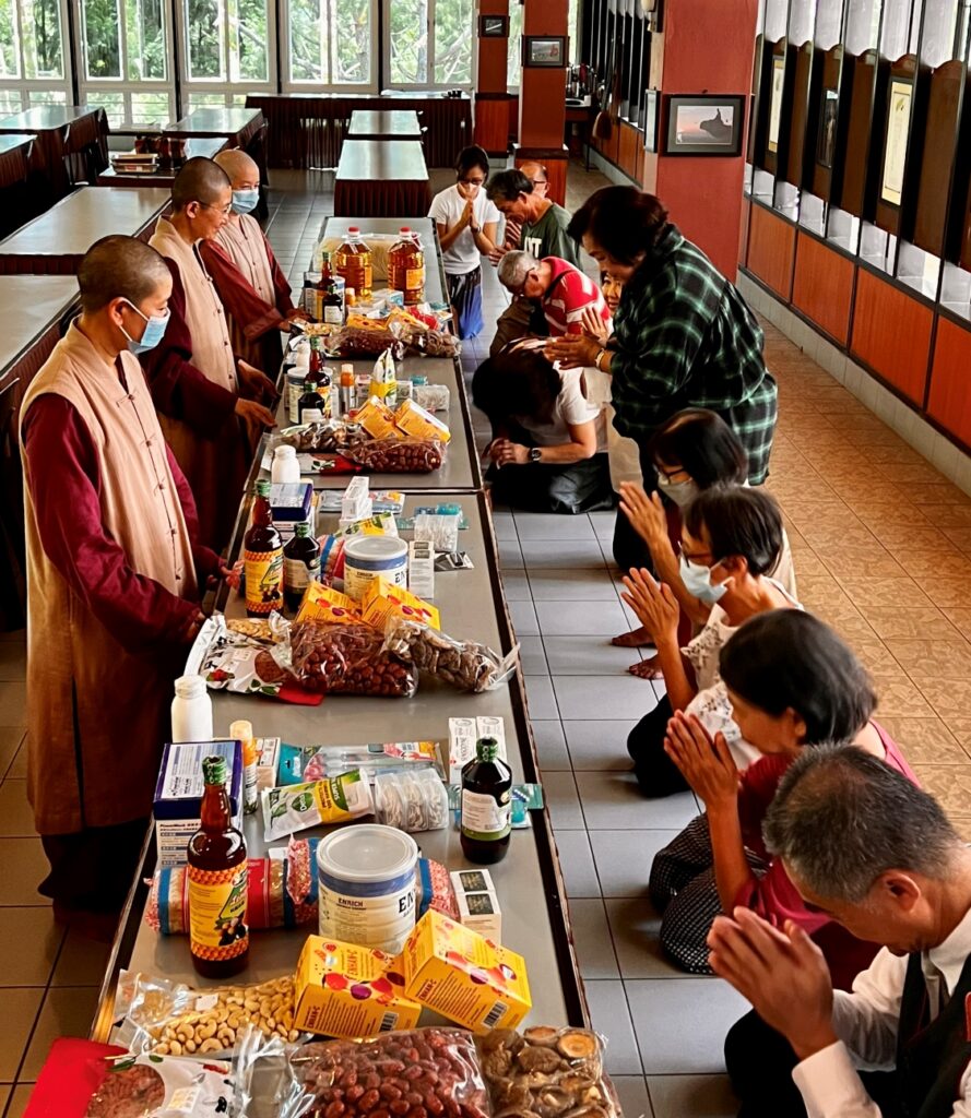 寂因會長於午餐後領眾供養法師們四資具,及視頻遠在國外的方丈開仁長老及開印阿闍梨,也齊聲祝賀長老們佛陀日吉祥快樂。