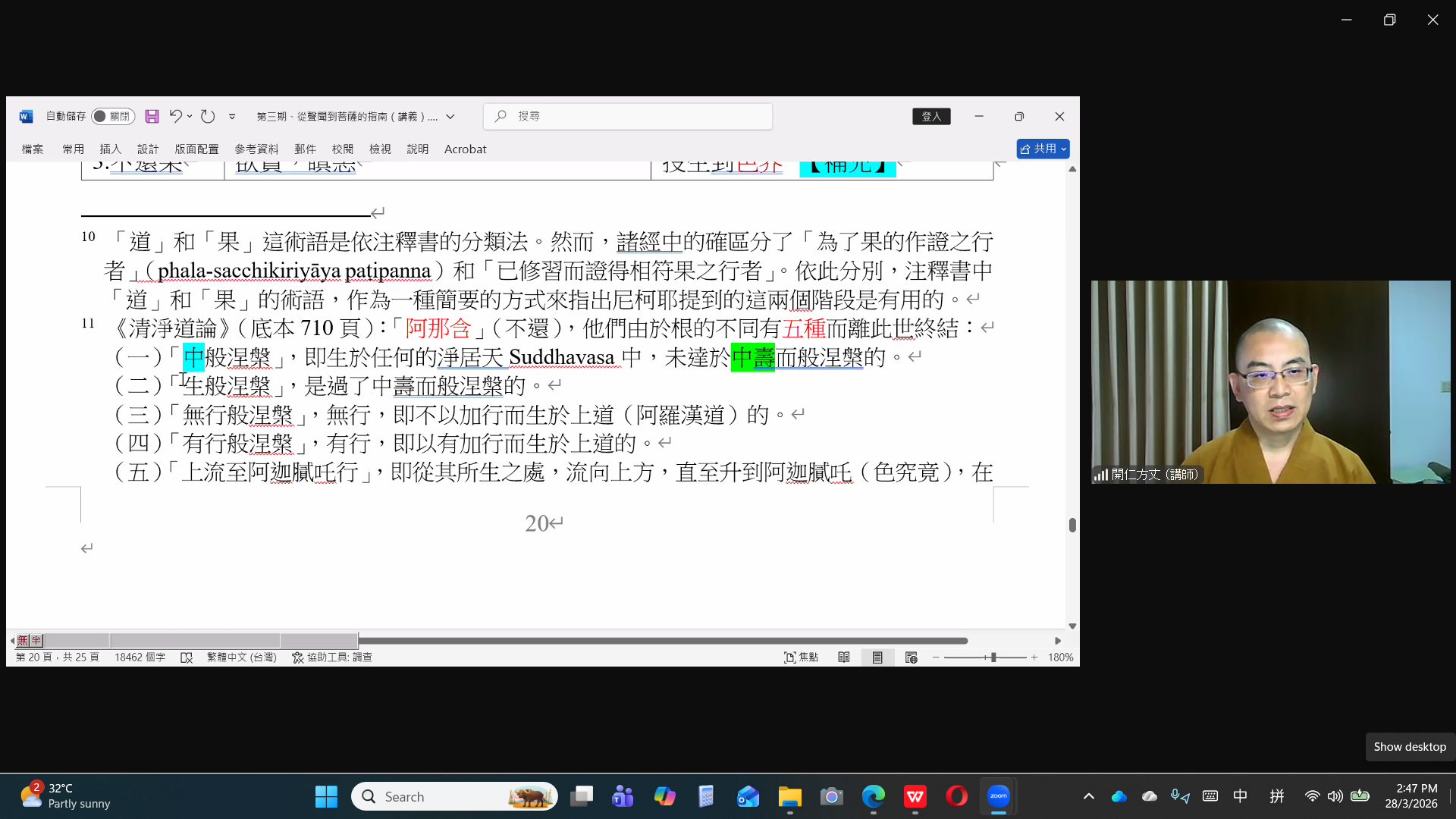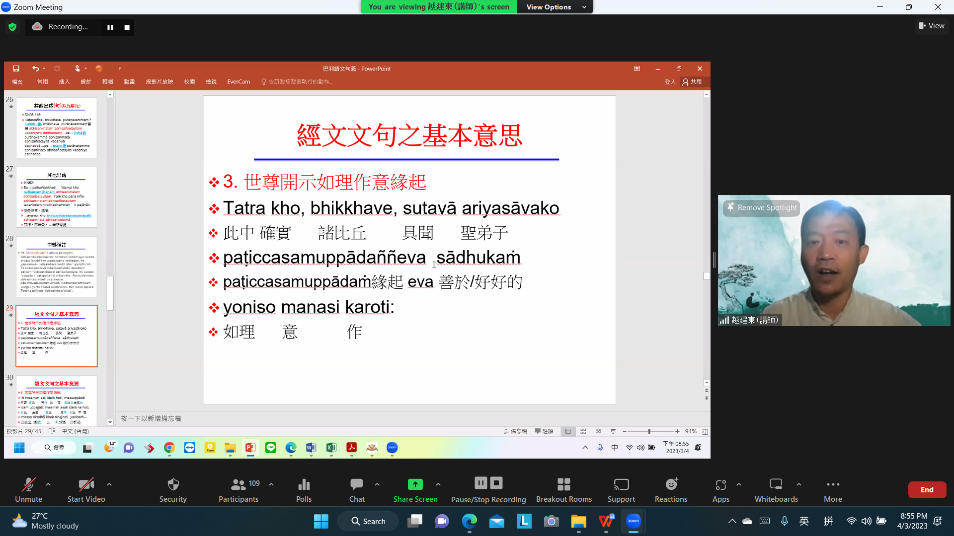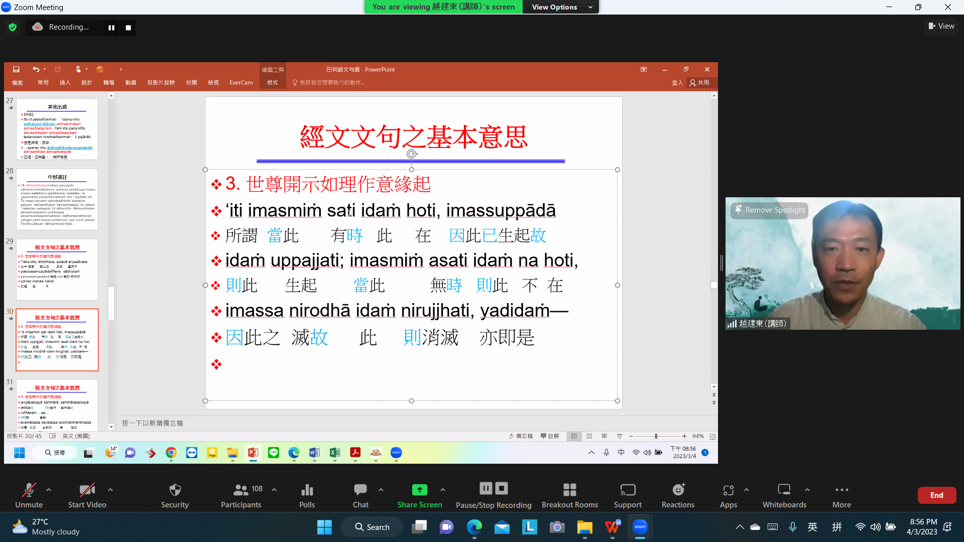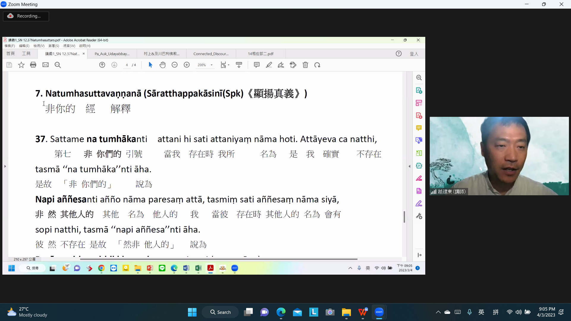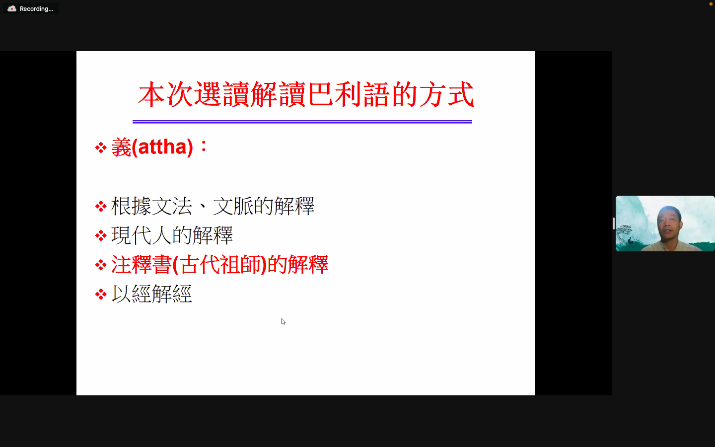 越老師精於印度佛教哲學、佛教經典語言與文獻,並對禪修、阿毘達磨心識都有涉獵,也熟悉佛教與科學之間的對話。因此於2023年3月5日開課當天,越老師就向學員們介紹如何研讀巴利原典。「以文、以句、以義、以南北經典對讀,再參考近代著作…」老師言簡意賅的傳授了如何閱讀巴利原典的基本功。接著,我們進入第一部經:相應部第12部第37經「非你們的經」(Natumhasuttaṃ)。老師就著他傳授的方式,一字一句的解釋經文及註釋, 把相關阿含經並列,也分享了近代帕奧禪師對其中一些法義的詮釋。如此系統性的分析,著實讓學員們眼界大開!