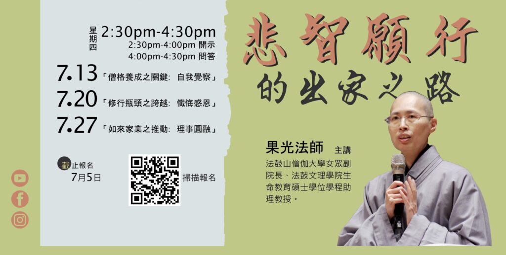 講師簡歷:法鼓山僧伽大學女眾副院長、法鼓文理學院生命教育碩士學位學程助理教授