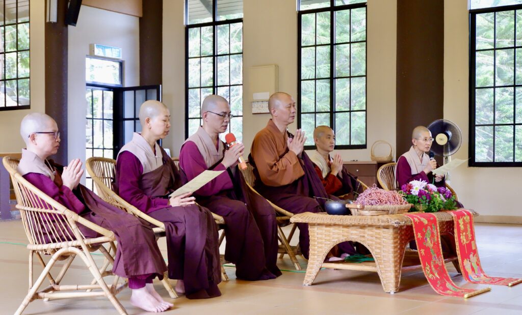 首先是由開律長老致祝福詞,長老祝願大眾幸福安康,菩提增上。接著是方丈開仁長老開示。方丈以佛陀說的四種人,即「從暗入暗、從暗入明、從明入暗、從明入明」為主題進行開示,勉勵大眾要做「從暗入明」、或「從明入明」的人。至於如何「入明」?方丈提到要從三方面下手,第一,應從生活中的點滴開始培養好的習慣,多花時間運用在培養善法上。第二,要培養心的寧靜,方丈提到現代人很多精神上的疾病,源於無法找到內心的平靜,經典中佛陀將六根比喻為六種不同的動物,每種動物都在向外攀緣,而正念就像因陀羅柱,把六種動物栓綁在這跟柱子上,心就能平靜下來。第三,要學會智慧的觀察。藉此三個方法,就可以幫助我們走向光明的大道。