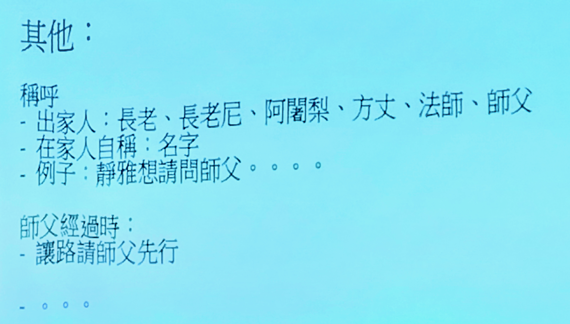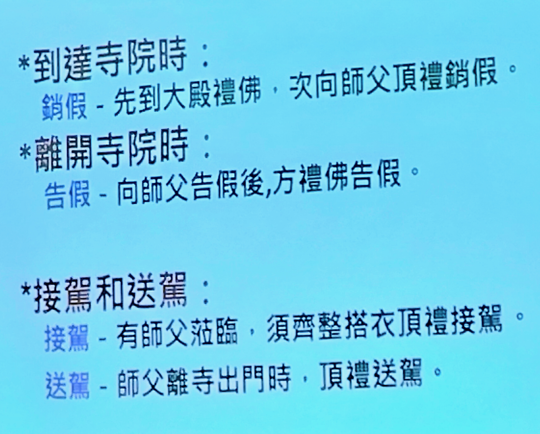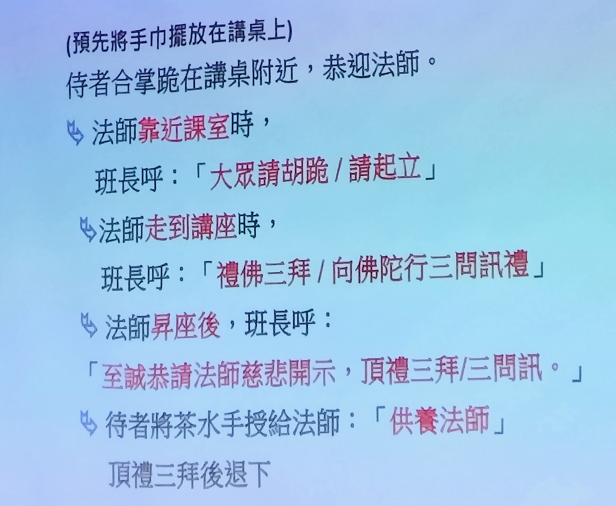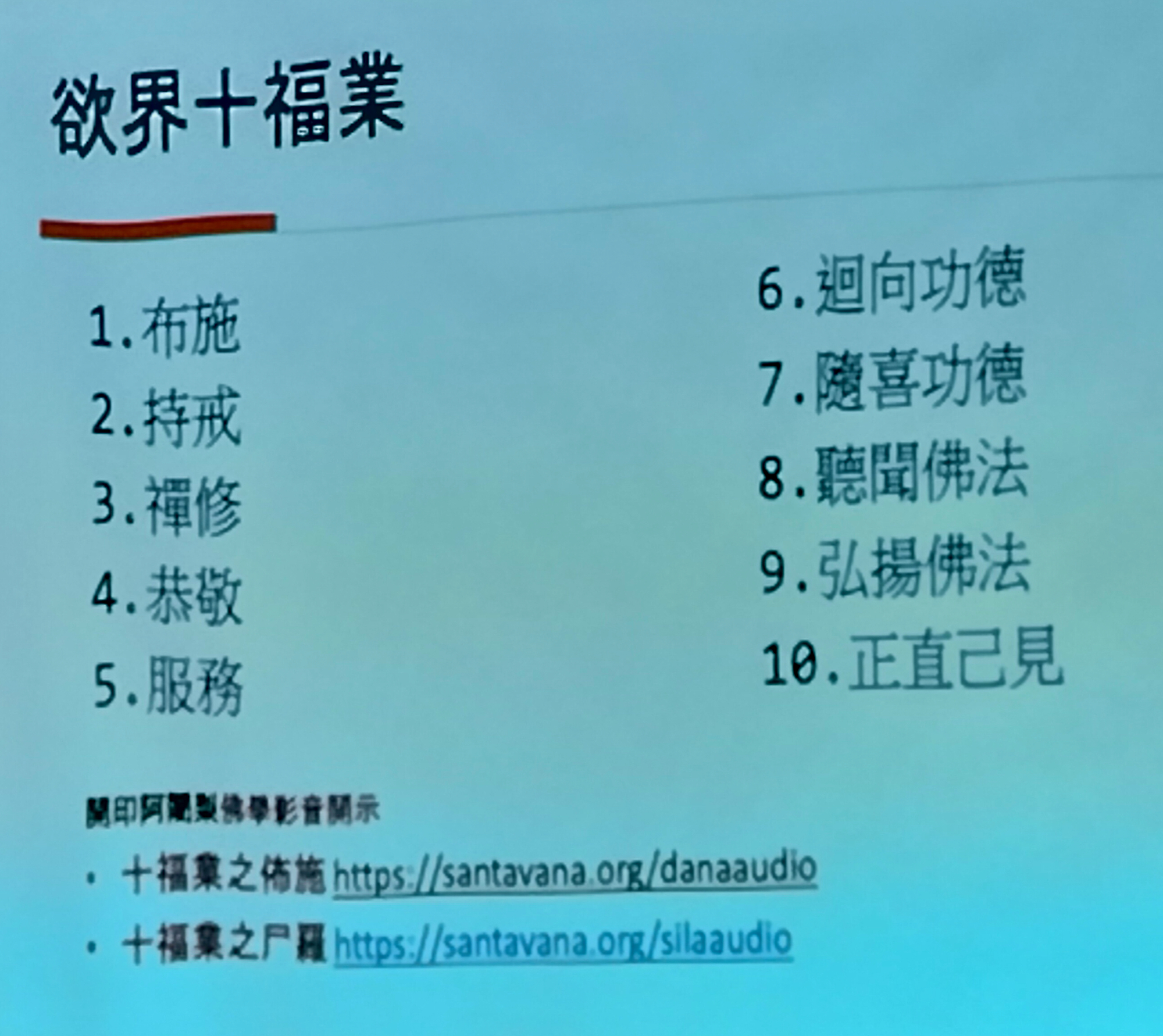 靜雅老師在分享佛門禮儀時提醒佛弟子去寺院時需穿著端莊樸素,抵達後先禮佛並向法師頂禮,同時也教導禮佛方式,親近法師應注意的基本禮儀等,老師最後勉勵學員應常常讓自己有機會到寺院親近善知識,修習欲界十福業,藉此培養自己的恭敬心。