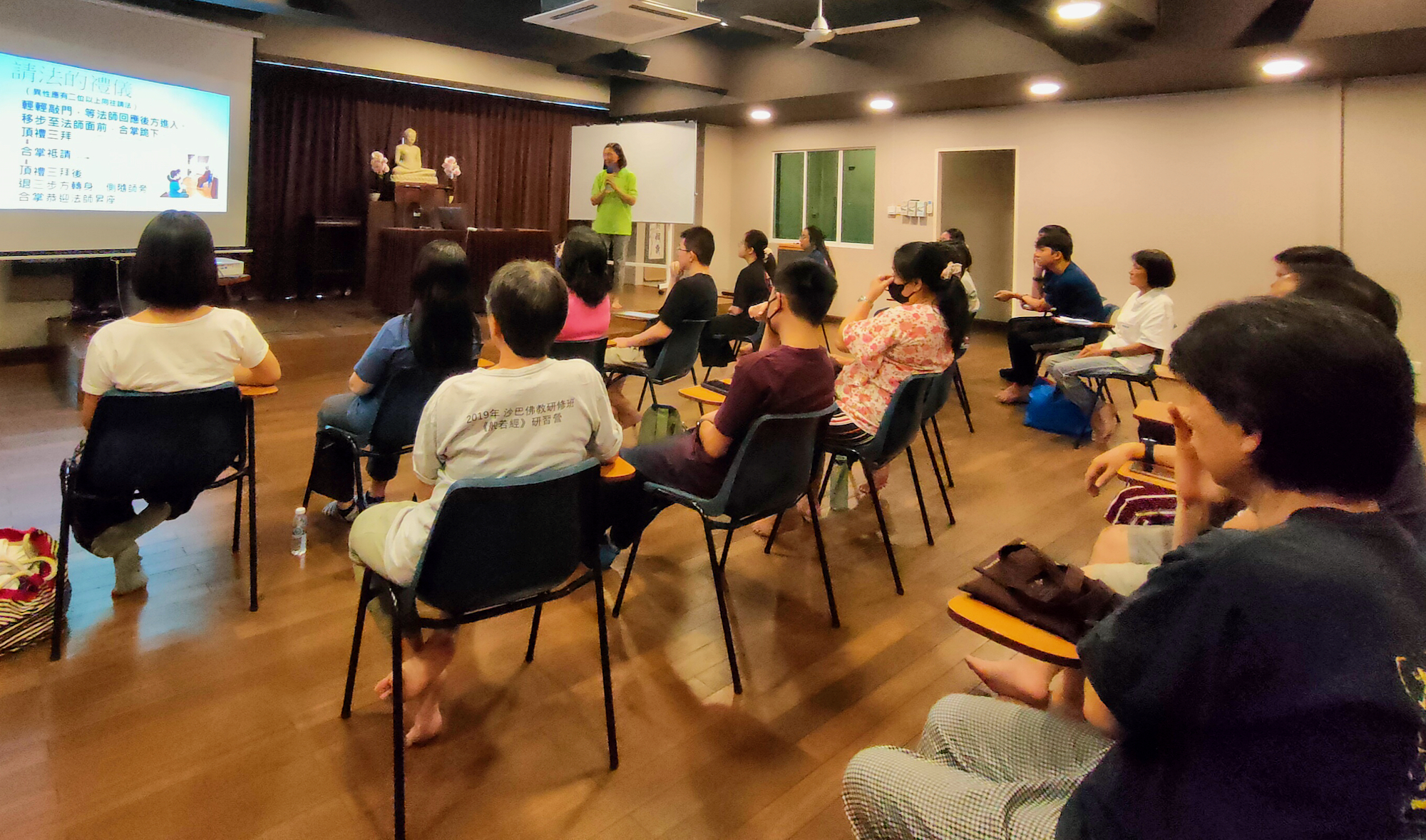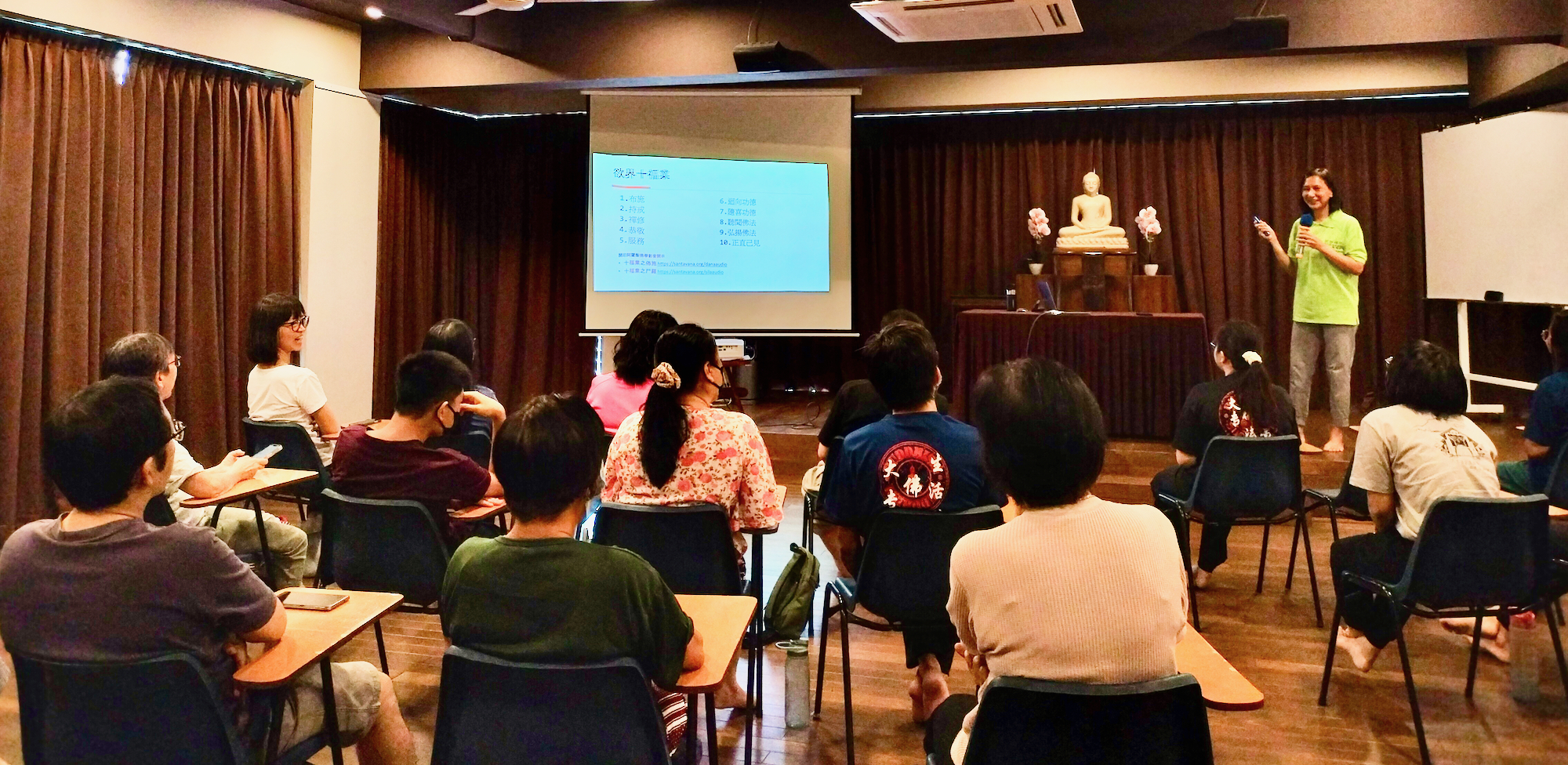 繼禪正法師在第一堂課介紹了佛寶後,靜荷老師在第二堂課則以生動有趣的個人經驗向學員們分享法寶的可貴,並以深入淺出的方式向學員介紹了佛法的核心思想即四聖諦與八正道,同時也闡明佛陀所教導的法是可以成為日常生活的指南。