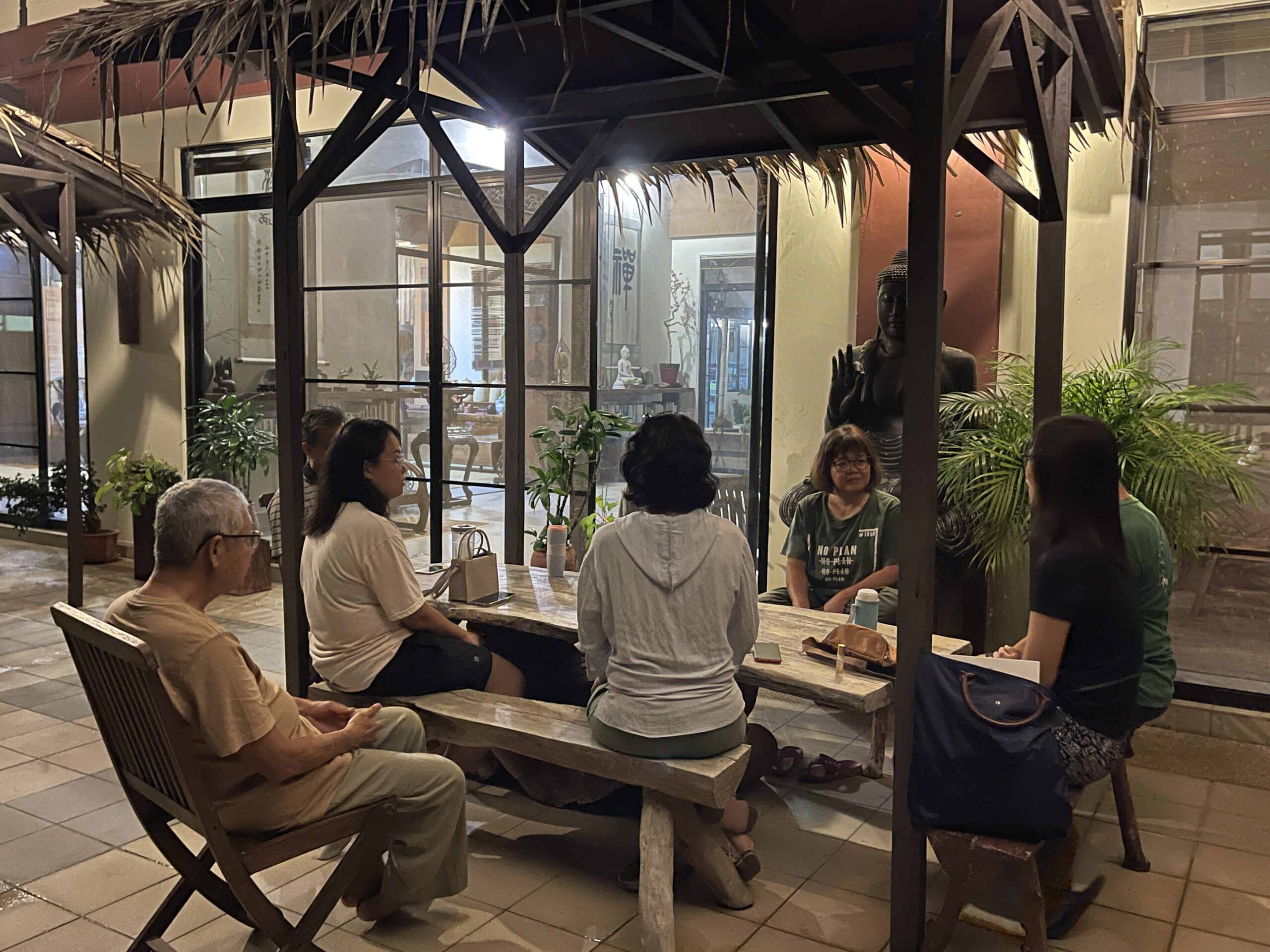 晚課後,燕芬(禪林住眾)也隨行大家,一起在在「心曠樓」欣賞星空一會之後,輕鬆樂愉的享受自然風坐下談法。
