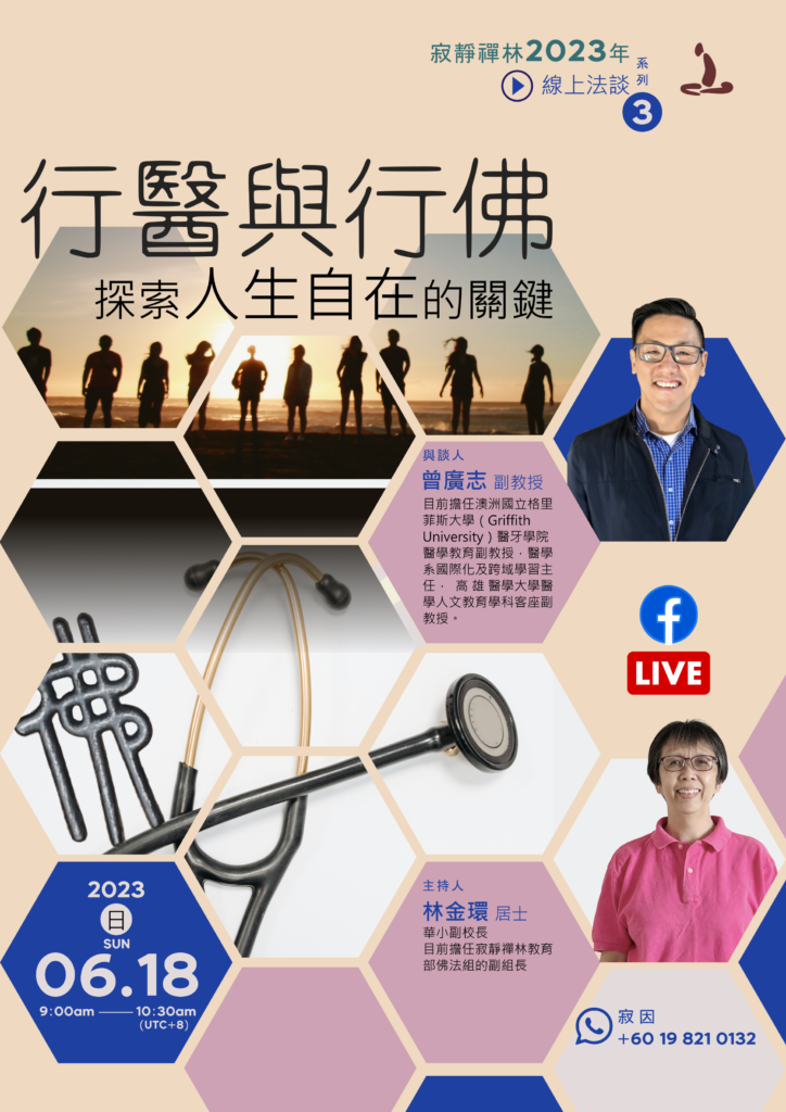 寂靜禪林於2023年的線上法談系列已經於4月13日及5月21日順利舉行。第三場將於6月18日進行,講題是「行醫與行佛:探索人生自在的關鍵 」,與談人是曾廣志博士。