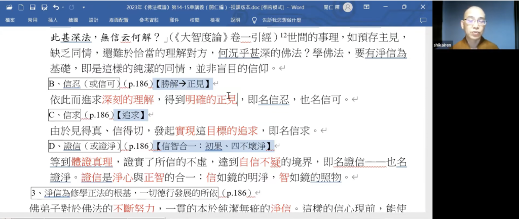 在幾位老師授課當中,對筆者影響至深的,莫過於開仁老師的授課方式。在老師對第十五章——佛法的信徒講解中,感受到老師或以導師早期及晚期的著作,相輔相成或加以其他經論輔助,來解讀導師《佛法概論》一書。課中老師提及,畢竟此書是導師非常早期的著作,隨著年代歷久,導師自己也有不同的體悟,早、晚期之論述,難免就有些變化,不可專讀一本也不能執一為全。再者,在課程中,往往受到老師或是語重心長之共勉法語,經驗分享,又或長輩對後學的種種提示。是棍棒也好,是冰水也好,令人自省反醒得快。很不好意思的下個定論,往往對於此類法語,受益頗多有時還勝於課文的講解,令筆者法喜滿滿。