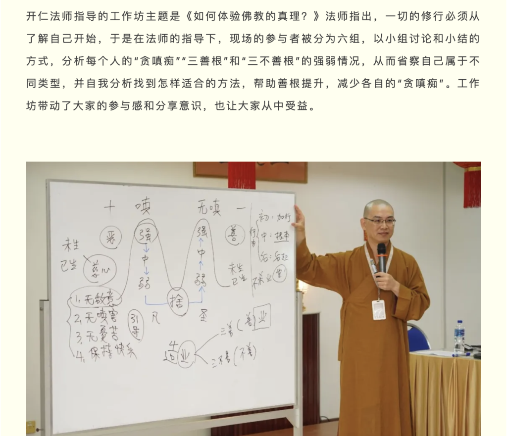 開仁法師指導的工作坊主題是《如何體驗佛教的真理?》法師指出,一切的修行必須從瞭解自己開始,於是在法師的指導下,現場的參與者被分為六組,以小組討論和小結的方式,分析每個人的「貪嗔痴」「三善根」和「三不善根」的強弱情況,從而省察自己屬於不同類型,並自我分析找到怎樣適合的方法,幫助善根提升,減少各自的「貪嗔痴」。工作坊帶動了大家的參與感和分享意識,也讓大家從中受益。