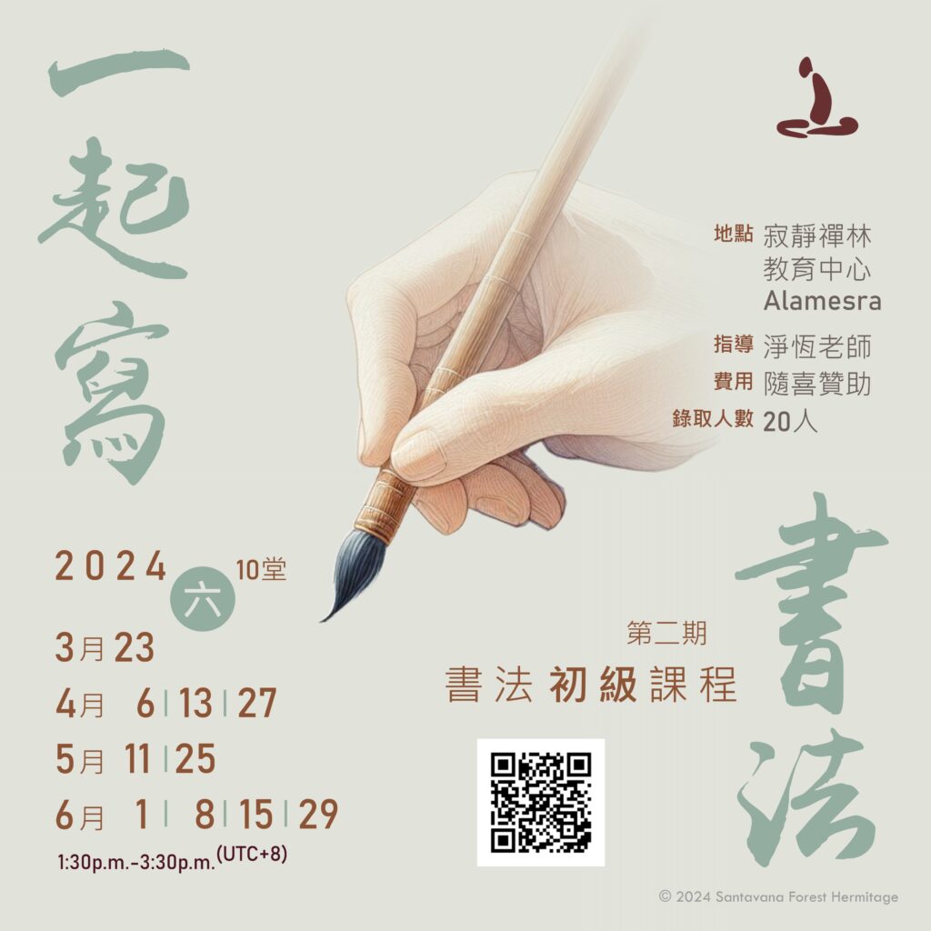 日期:2024年1月13、20、27日,3月 23日 ,4月 6、13、27日,5月 11,25日,6月 1、8、15、29日,7月 6、27日,8月 3、10、24日,9月 7、14、28日,10月12、19日(六) 時間:1:30p.m.-3:30p.m.(1-6月);2p.m.-4p.m.(7-10月) 地點:寂靜禪林教育中心, Alamesra, 亞庇 指導:吳老師(淨恆) 費用:隨喜贊助 錄取人數:20人 (已額滿)
