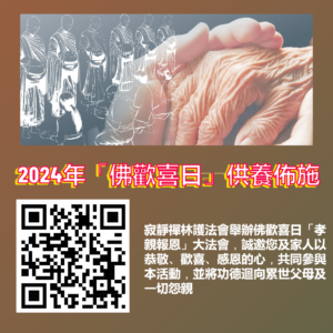 寂靜禪林護法會舉辦佛歡喜日「孝親報恩」大法會,誠邀您及家人以恭敬、歡喜、感恩的心,共同參與本活動,並將功德迴向累世父母及一切怨親。願所有的不幸皆能轉化,願所有的疾病皆消除,沒有險難及不幸。願生者得福,逝者得以離苦往生善趣。