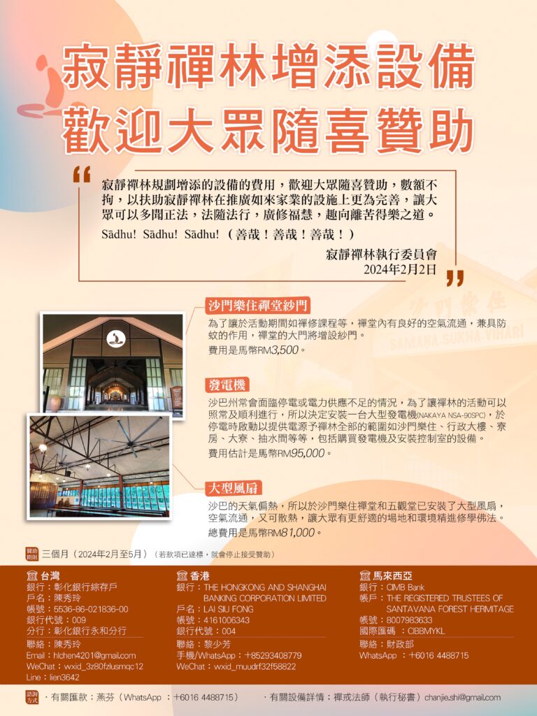 寂靜禪林增添設施的費用已籌足夠了,由衷感恩大眾發心的護持,扶助禪林推廣佛教教育,使眾生通過聽聞正法而獲得法的利益。因此即今日起,就終止籌募的活動,願諸布施者藉此善行成為您們菩提道上的資糧,趣向離苦得樂的涅槃大道。