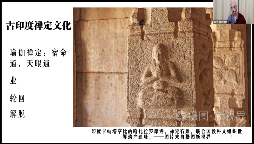 衍真和尚講解了佛陀在成道之前,古印度當時盛行的修行文化就是修習瑜伽禪定,有的修行者可證得宿命通和天眼通,對業果關係和眾生輪迴的現象有一些了解,進而尋求解脫輪迴的方法。也有某一些人通過修習種種「苦行」的方式,以期達到身心的解脫。