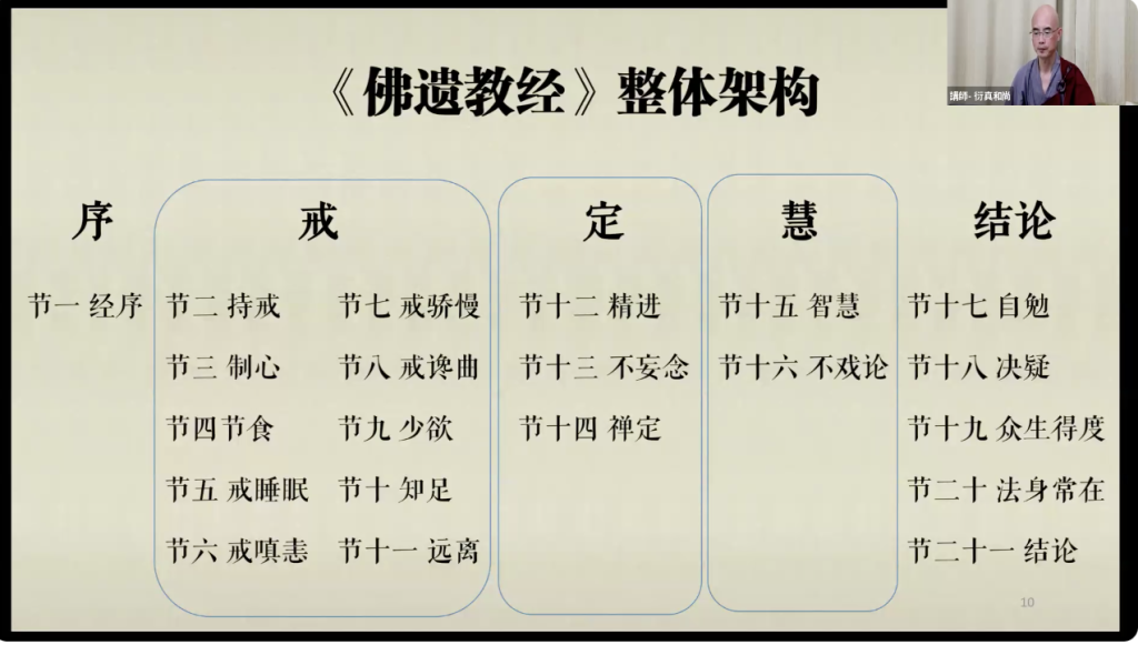 最後,衍真和尚介紹了《佛遺教經》的整體架構,內容共有二十一節,除了經序和最後五節是結論之外,間中的章節可歸納為戒定慧三學。學員們聽課後法喜充滿,很期待下一堂課的到來。