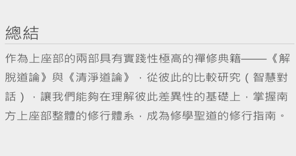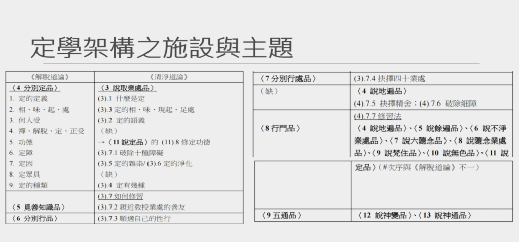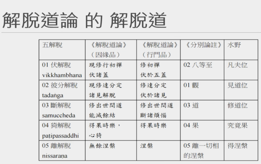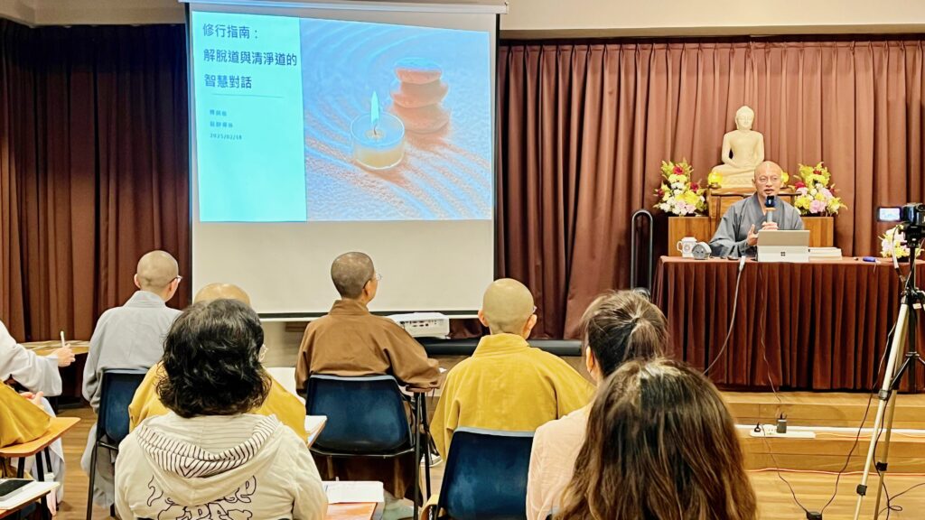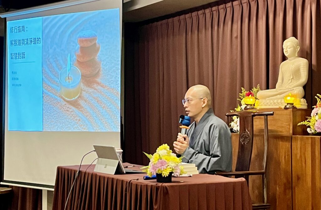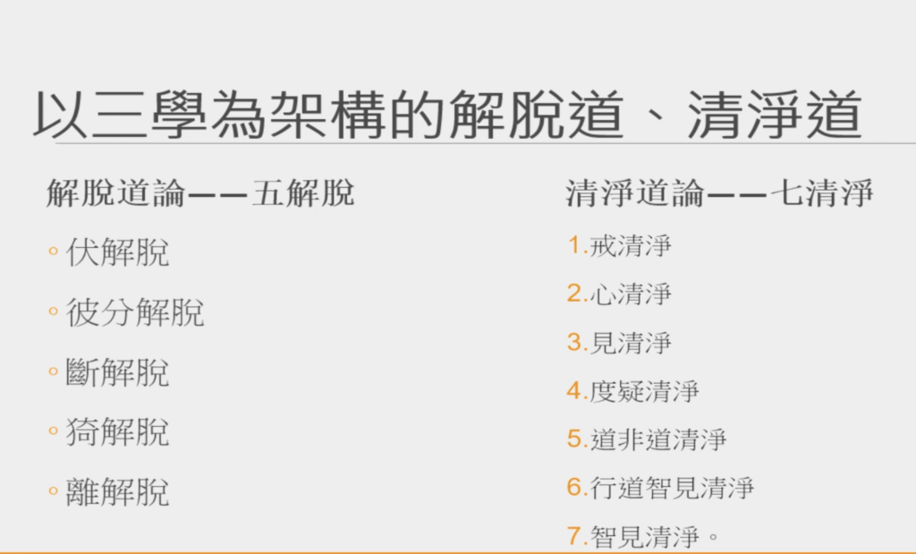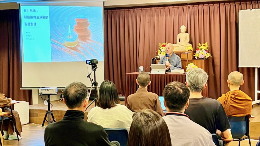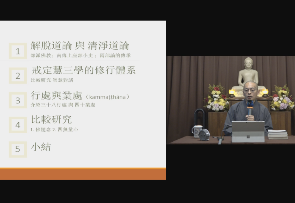 接著,法師講解此二論同以戒定慧三學的架構,卻有著不同的施設——五解脫(解脫道論)和七清淨(清淨道)的次第,也介紹三十八行處和四十業處的對照,點出異同。法師選了論中的佛隨念及四無量心的禪修方法,作為智慧對話的例子。兩者有各自互補的功能。比如佛隨念,當用不上功夫時,《解脫道論》有提出五種作為輔助的方法 :以本昔因緣、以起自身、以得勝法、以作世間饒益,以及隨念過去、 未來佛;這些敎導在《清淨道論》皆沒有提及,使行者 在實踐上會有更多的方便。簡要言之,兩論之間有許多諸如此類的異同,等待行者去發掘。
