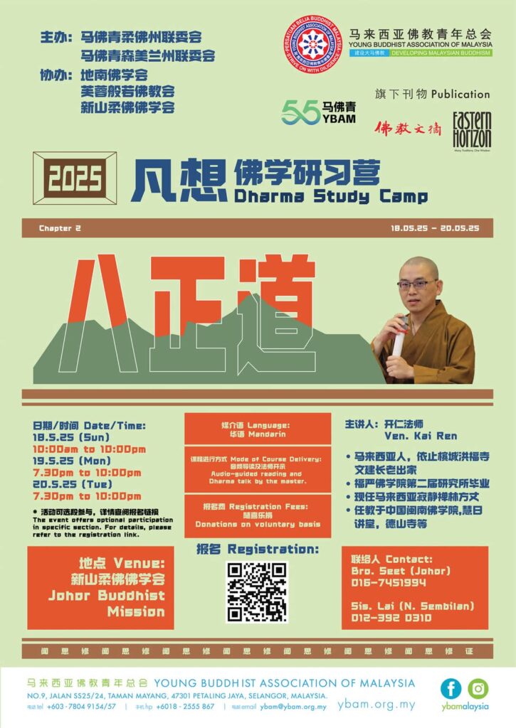 2025年5月18日(日)-20日(二)方丈主持 「八正道 -『凡想』 佛學研習營」 於 馬來西亞 柔佛 新山,由 馬佛青柔佛州聯委會 與 馬佛青森州聯委會聯辦,地南佛學會、芙蓉般若佛教會及新山柔佛佛學會協辦,經已圓滿結束,Sādhu!