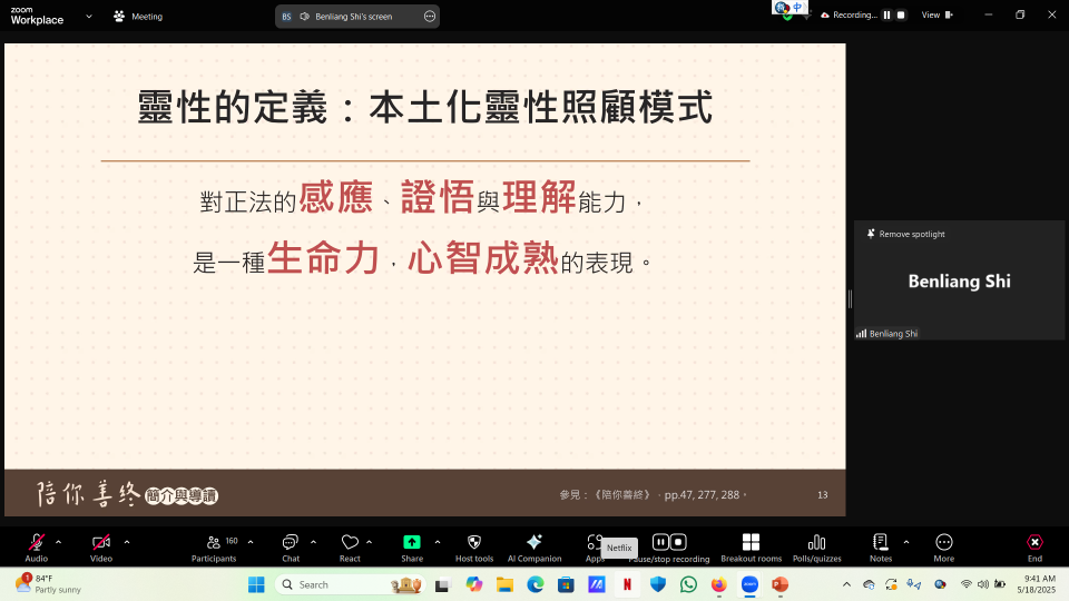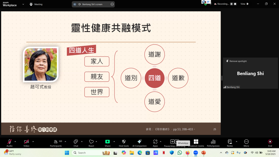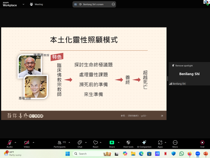 此課程由本良法師主講,法師結合佛教智慧與臨床照顧經驗,深入淺出地引導學員理解「善終」的多重面向,包括靈性困擾的陪伴、濒死症狀的辨識、臨終病人的心理狀態與家屬的照顧需求等。