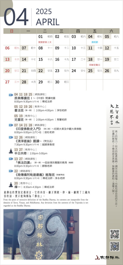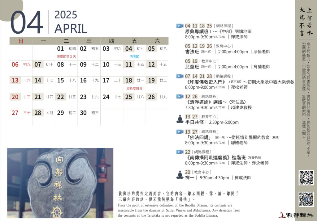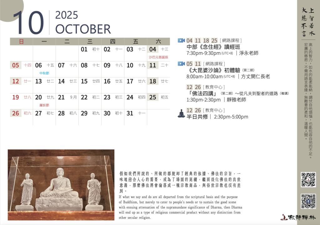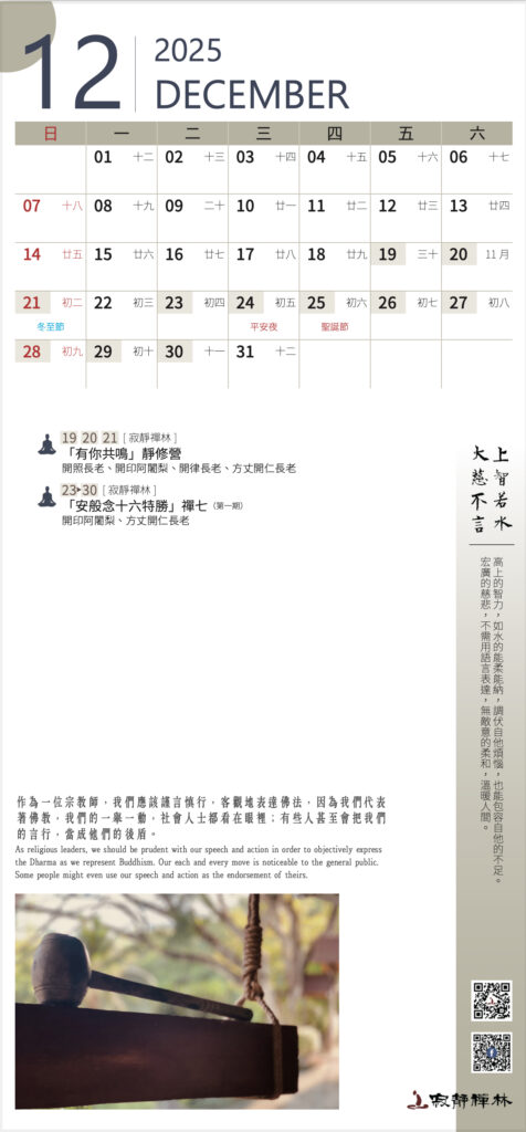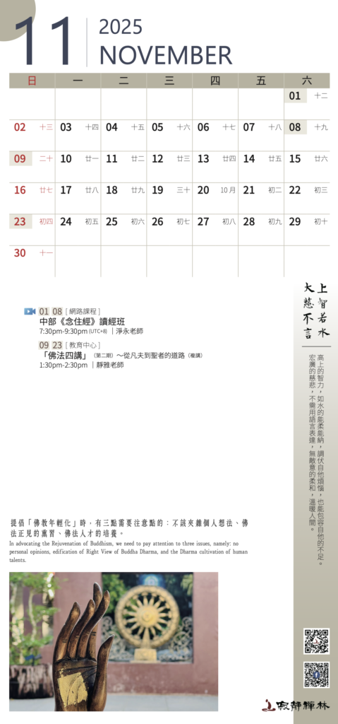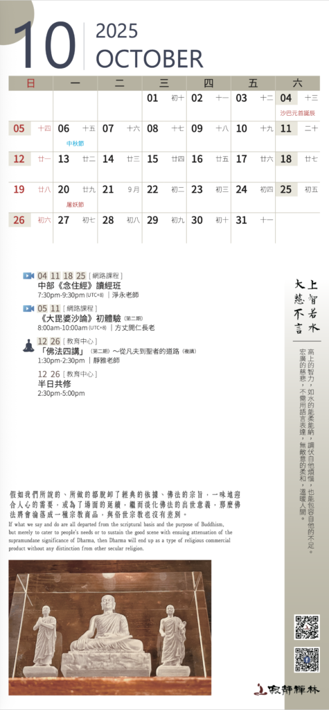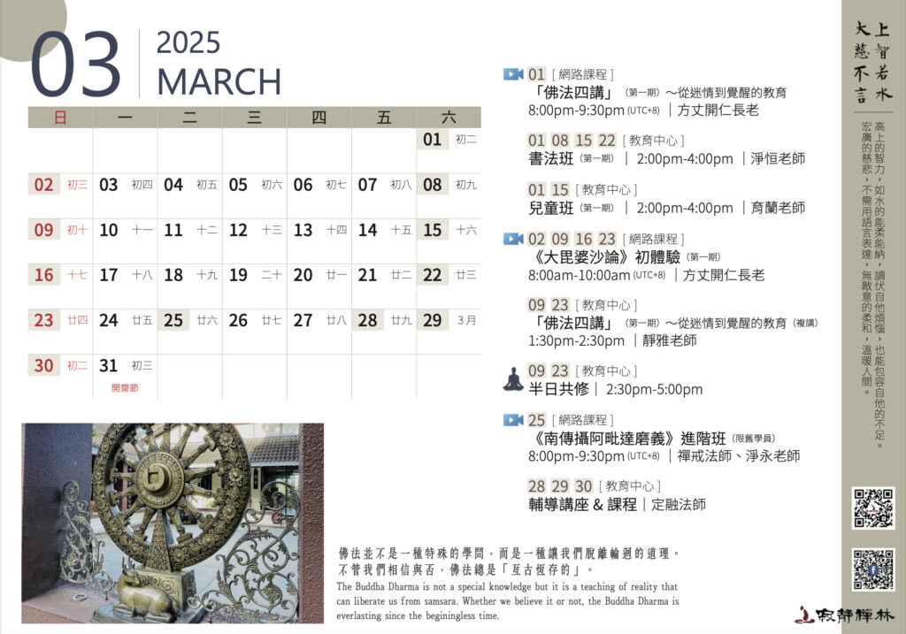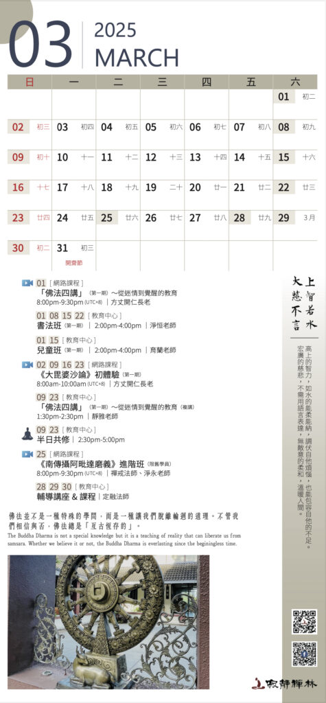 佛法並不是一種特殊的學問,而是一種讓我們脫離輪迴的道理。不管我們相信與否,佛法總是「亙古恆存的」。──寂靜禪林方丈開仁長老開示