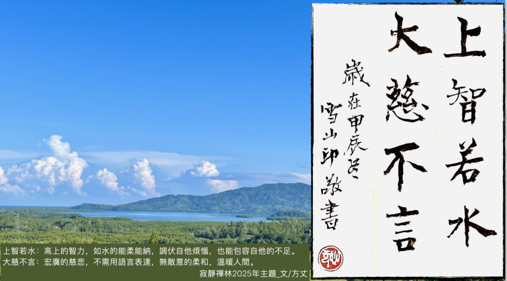 上智若水:高上的智力,如水的能柔能納,調伏自他煩惱,也能包容自他的不足。