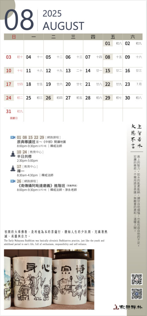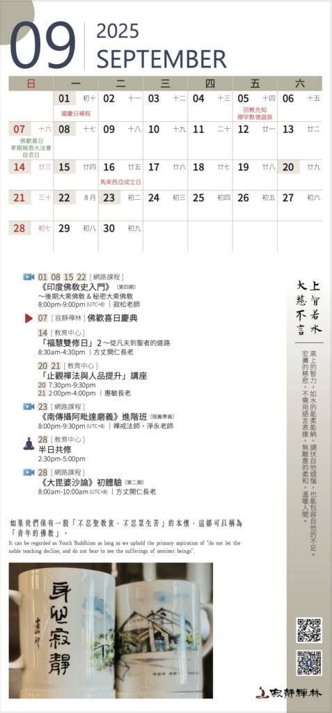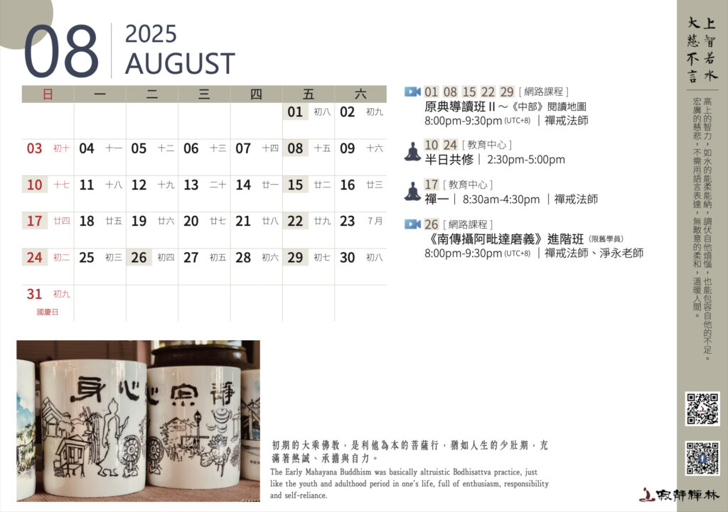 初期的大乘佛教,是利他為本的菩薩行,猶如人生的少壯期,充滿著熱誠、承擔與自力。──寂靜禪林方丈開仁長老開示