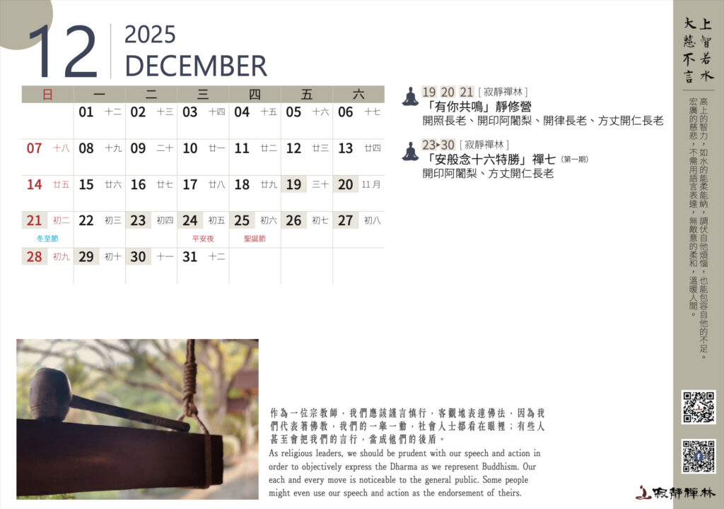 作為一位宗教師,我們應該謹言慎行,客觀地表達佛法,因為我們代表著佛教,我們的一舉一動,社會人士都看在眼裡;有些人甚至會把我們的言行,當成他們的後盾。──寂靜禪林方丈開仁長老開示