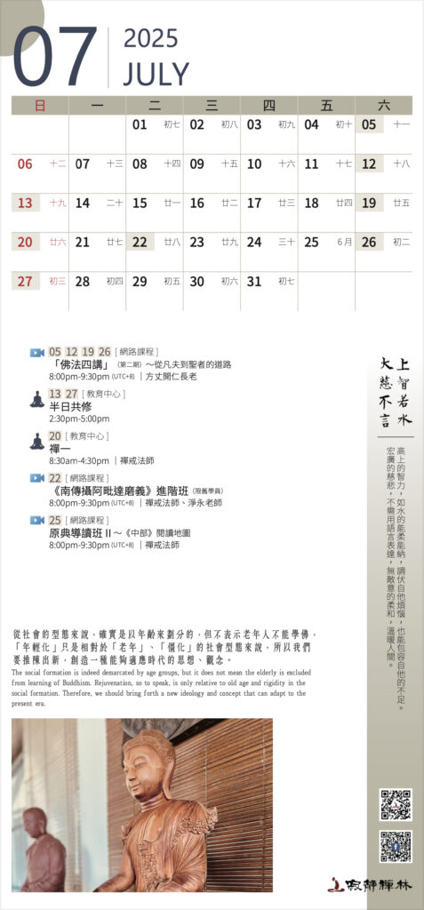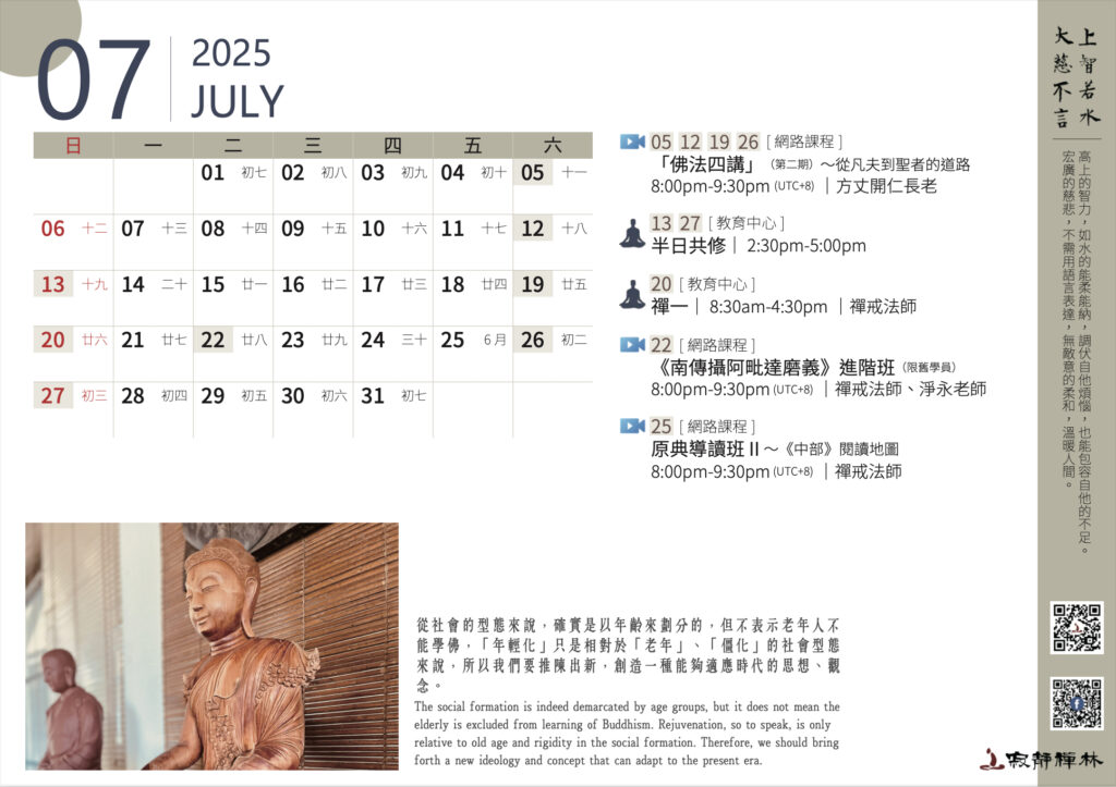 從社會的型態來說,確實是以年齡來劃分的,但不表示老年人不能學佛,「年輕化」只是相對於「老年」、「僵化」的社會型態來說,所以我們要推陳出新,創造一種能夠適應時代的思想、觀念。──寂靜禪林方丈開仁長老開示