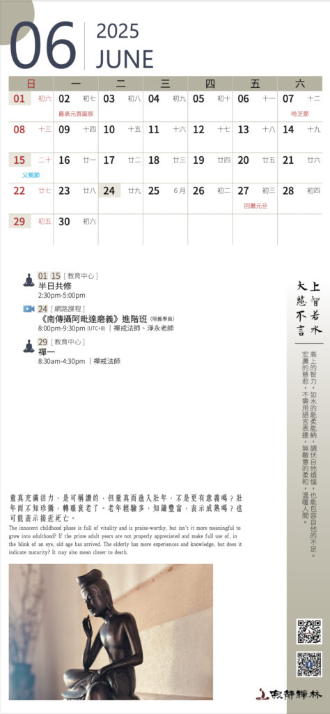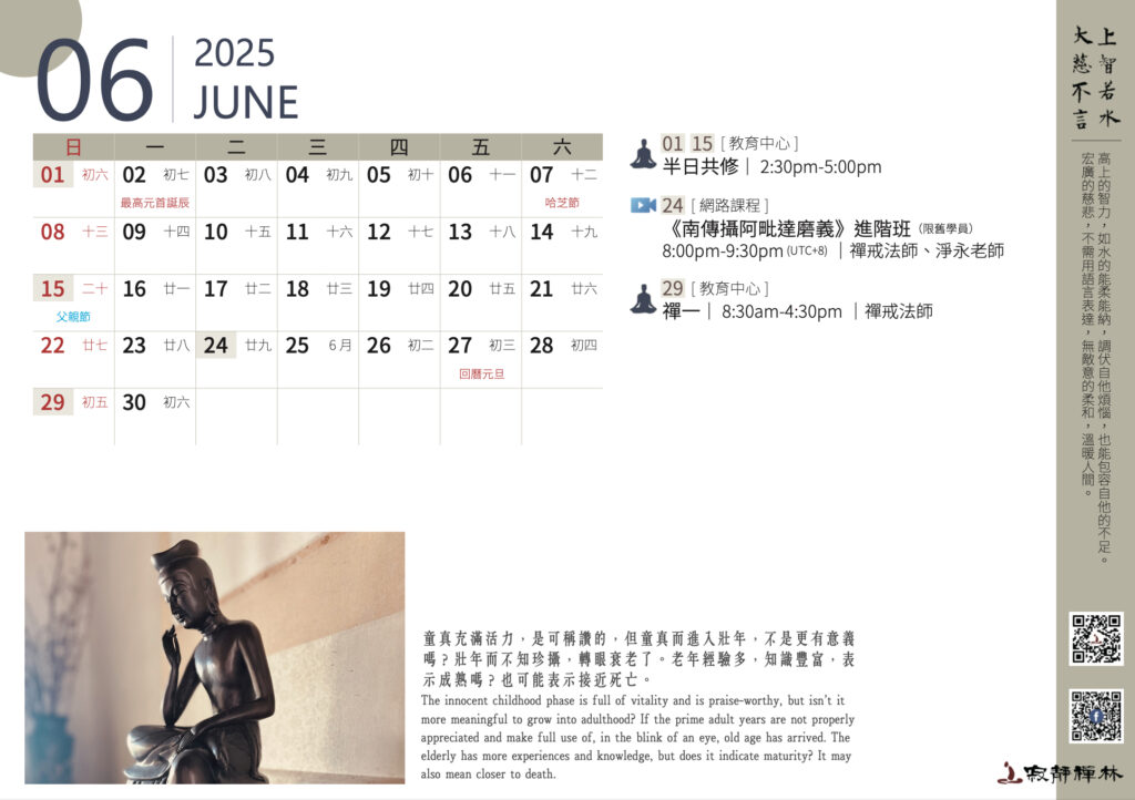 The innocent childhood phase is full of vitality and is praise-worthy, but isn’t it more meaningful to grow into adulthood? If the prime adult years are not properly appreciated and make full use of, in the blink of an eye, old age has arrived. The elderly has more experiences and knowledge, but does it indicate maturity? It may also mean closer to death. Thera Kairen‘s Words (The Abbot of Santavana Forest Hermitage)