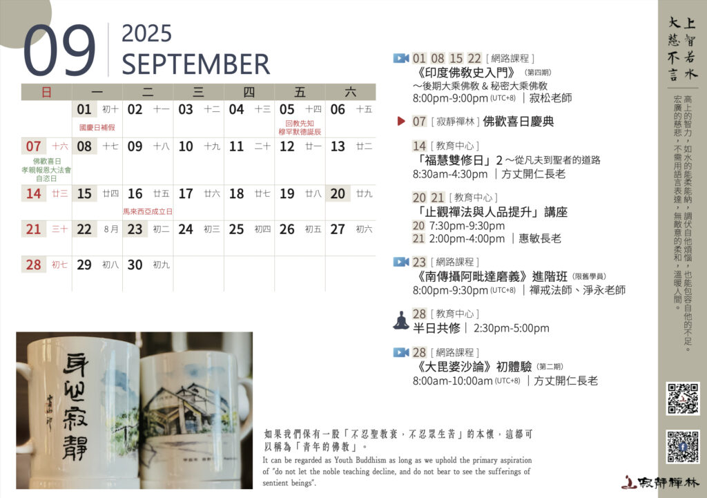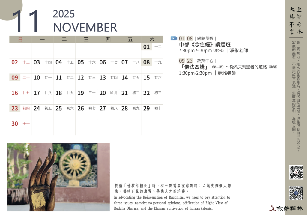 In advocating the Rejuvenation of Buddhism, we need to pay attention to three issues, namely : no personal opinions, edification of Right View of Buddha Dharma, and the Dharma cultivation of human talents. Thera Kairen‘s Words (The Abbot of Santavana Forest Hermitage)