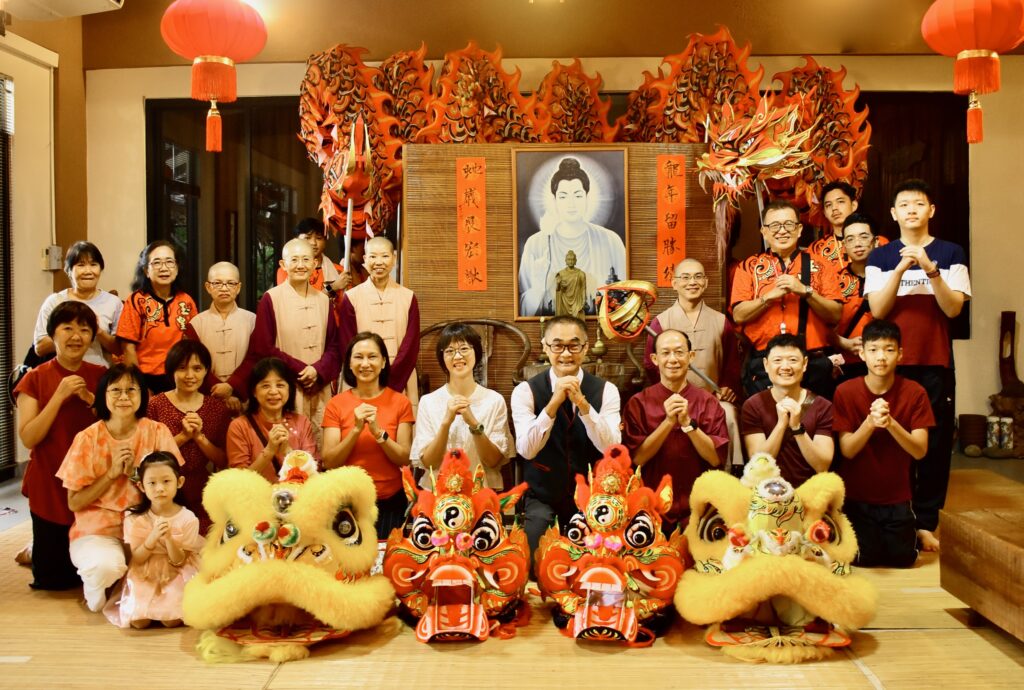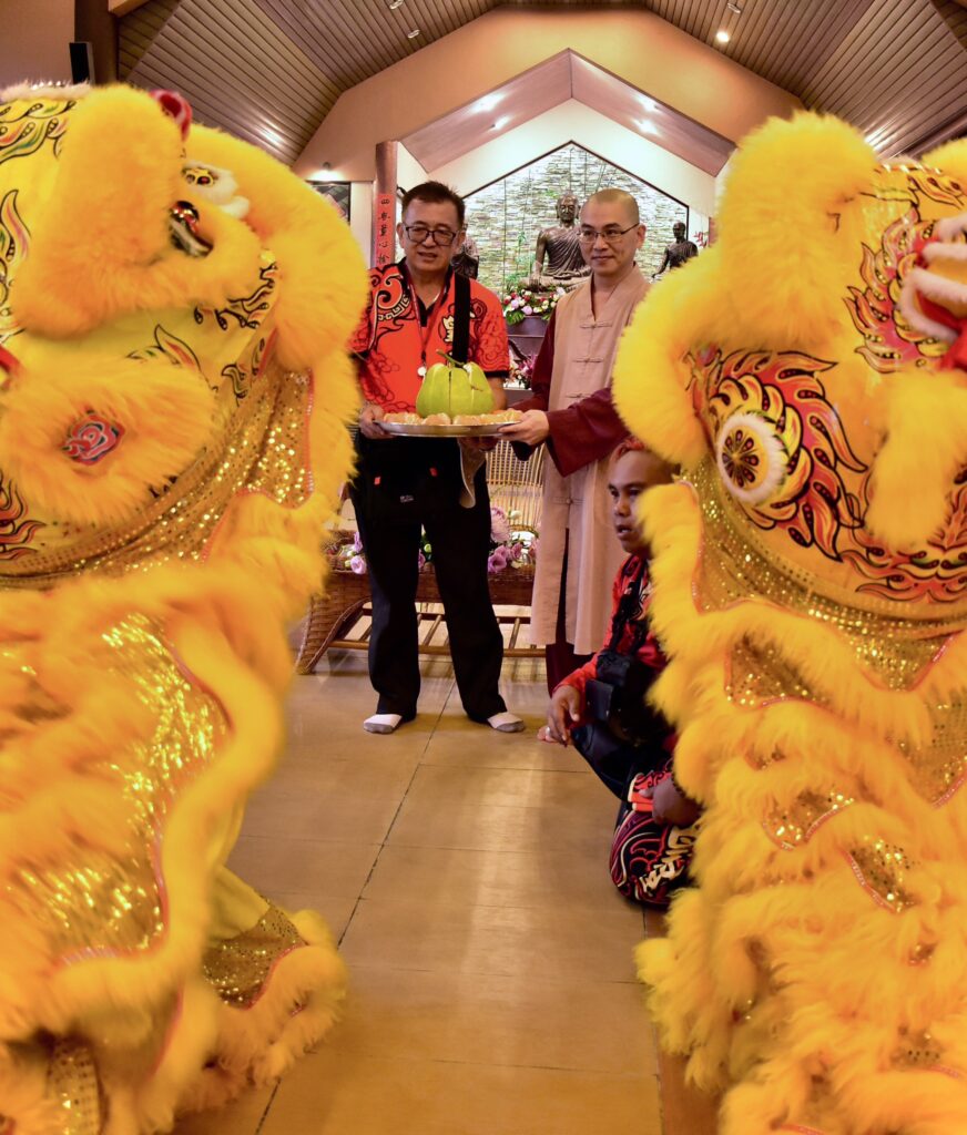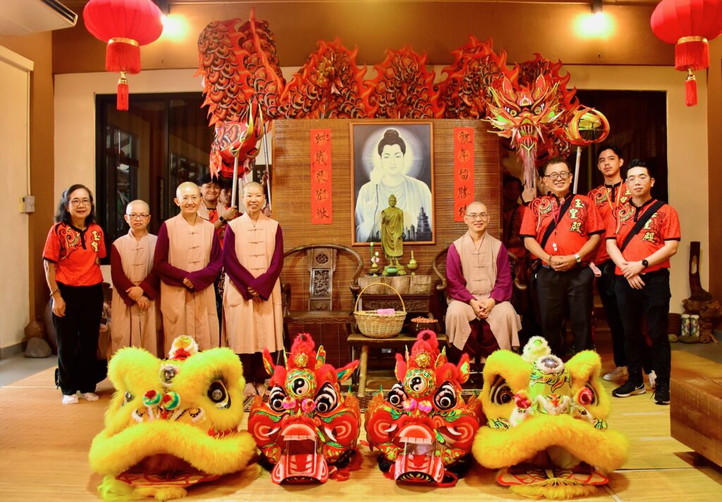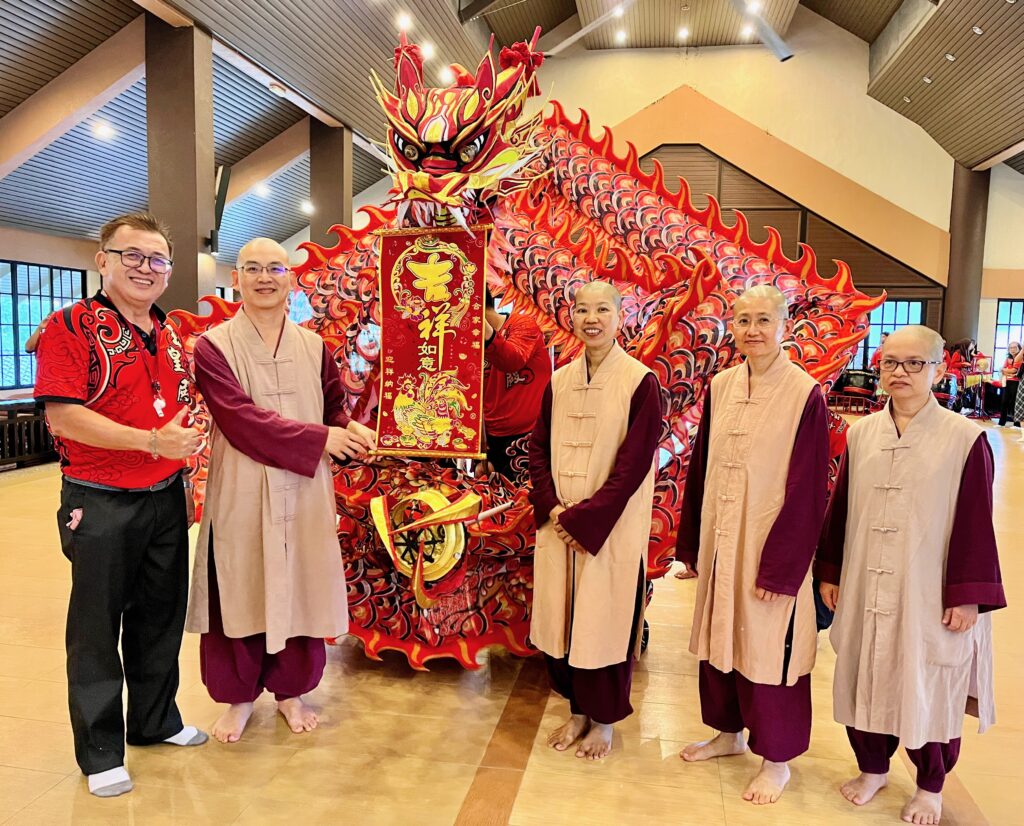 開春之際,細雨綿綿,今年斗亞蘭玉皇殿龍麒獅團呈現了別具一格的室內舞獅舞龍表演,向僧團與大眾拜年,以活潑靈動的龍獅表演為大年初一帶來興旺與熱鬧的氣氛,寓意著新年新氣象,好景好風光。接著,大眾移步到沙門樂住禪堂,聆聽法師的開示與祝福。