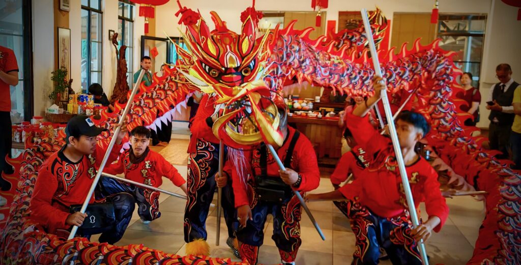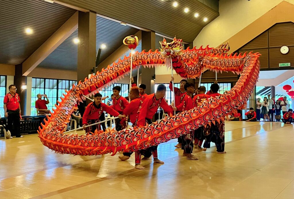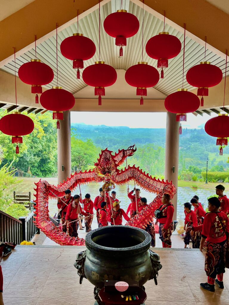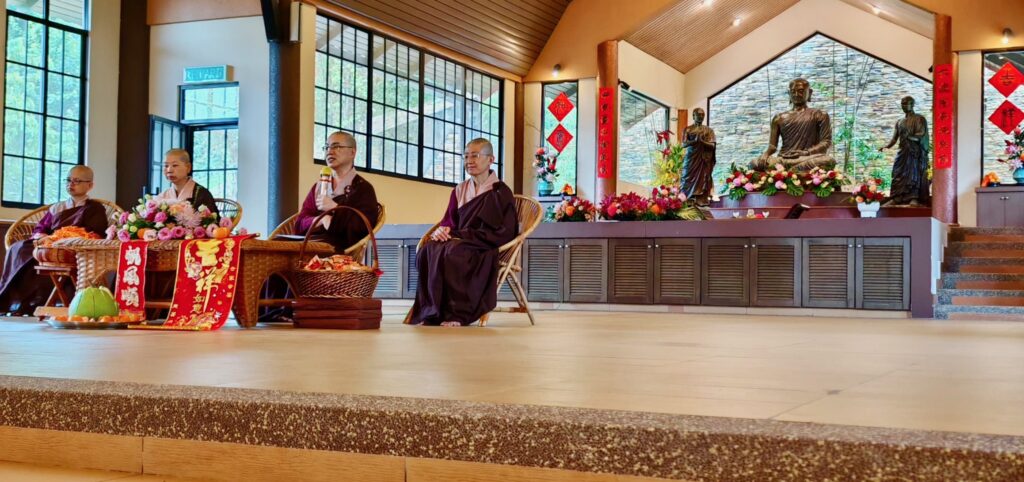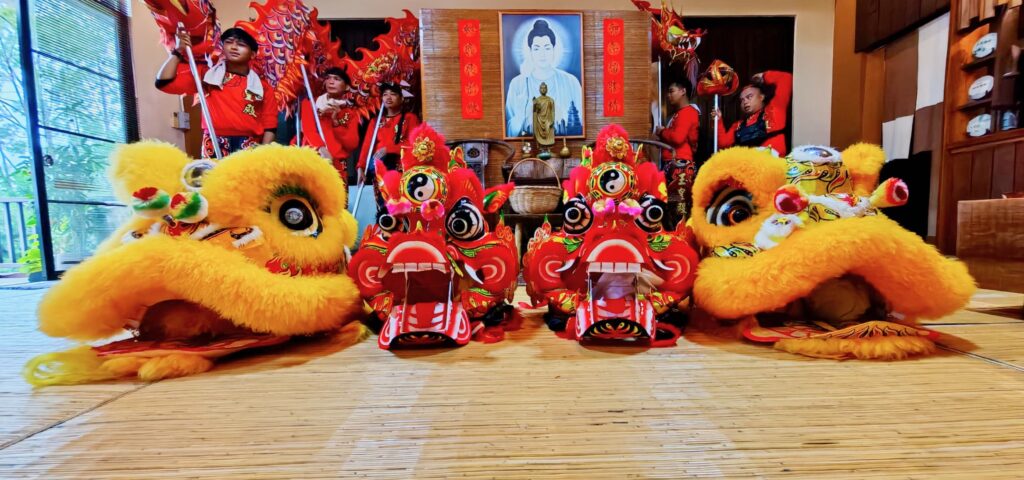 開春之際,細雨綿綿,今年斗亞蘭玉皇殿龍麒獅團呈現了別具一格的室內舞獅舞龍表演,向僧團與大眾拜年,以活潑靈動的龍獅表演為大年初一帶來興旺與熱鬧的氣氛,寓意著新年新氣象,好景好風光。接著,大眾移步到沙門樂住禪堂,聆聽法師的開示與祝福。