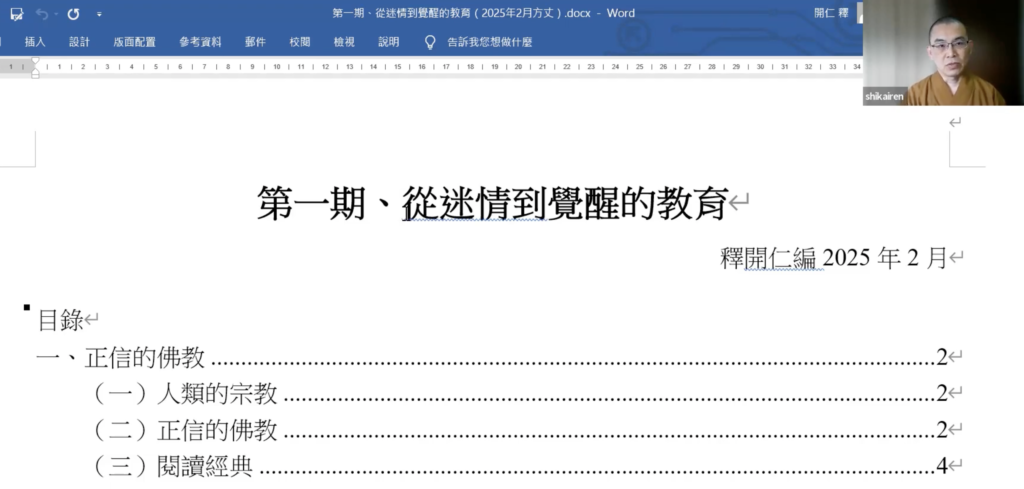 課堂最後,開仁長老勉勵學員,修行應從親近善知識開始,透過聽聞正法、如理思維、依教奉行,來深入理解佛法。此外,閱讀經典能幫助學員更全面地掌握佛法智慧。真正的佛法修行,不僅僅是理論的學習,更需要在日常生活中實踐,透過覺察當下的心念,破除迷信,培養慈悲心,進而達到智慧解脫,獲得真正的自在。