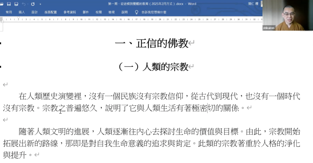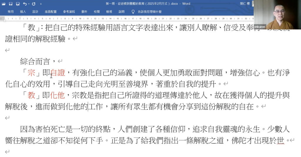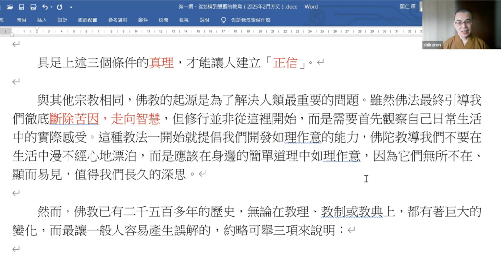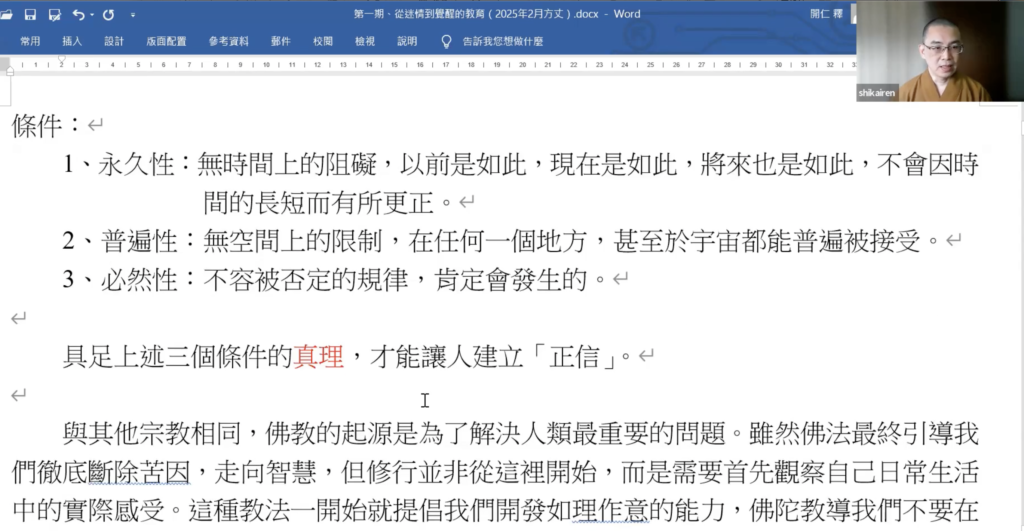 開仁長老在課堂中闡述,正信的佛教強調理性信仰,而非盲從或迷信。佛教作為一門自力宗教,主張個人應透過智慧解脫自身,而非依賴外力。正信的佛法應具備三大標準——永久性、普遍性與必然性,學習佛法應以智慧觀察日常生活,培養如理作意的思維。
