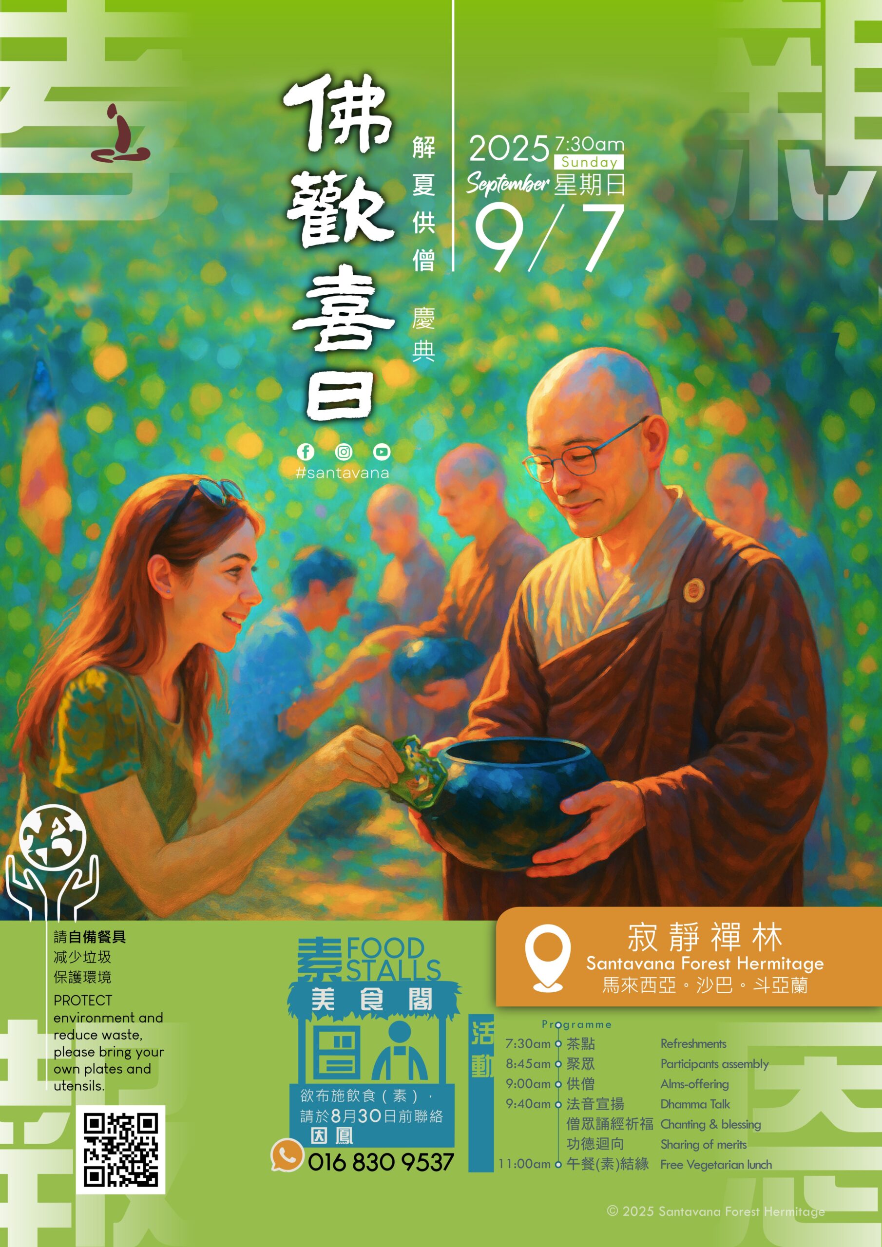 禪林亦推動環保惜福,呼籲參與者自備餐具,減少一次性垃圾。現場設有素食美食閣,欲參與布施食物者,請於8月30日前聯絡美食閣組長因鳳(016-830 9537)。
