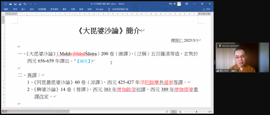 歡迎觀看錄製視頻學習《大毘婆沙論》