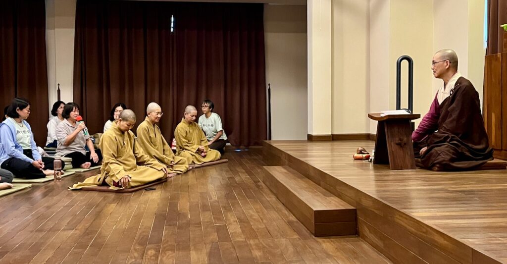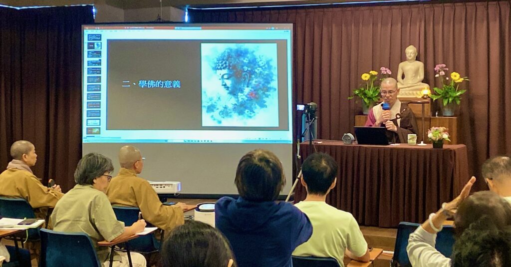 在分享環節中,有學員提到,隔了好久再次上初級佛法課程,還是很受用,很感動,藉此機會温故知新,對佛法有更深入理解。 另外,現場聆聽的受益良多,與平時通過網路AI搜索所得的資訊學習是有所差別。方丈在總結時給予勉勵, 佛法道理高深,但也是能從日常生活去觀察,去運用,讓自己從中獲益。,大家應該效仿佛陀意志堅定的精神,不輕易放棄自己的目標,培養決意心,持之以恒地以三歸五戒為行持準則,這樣能自利亦能令正法久住。